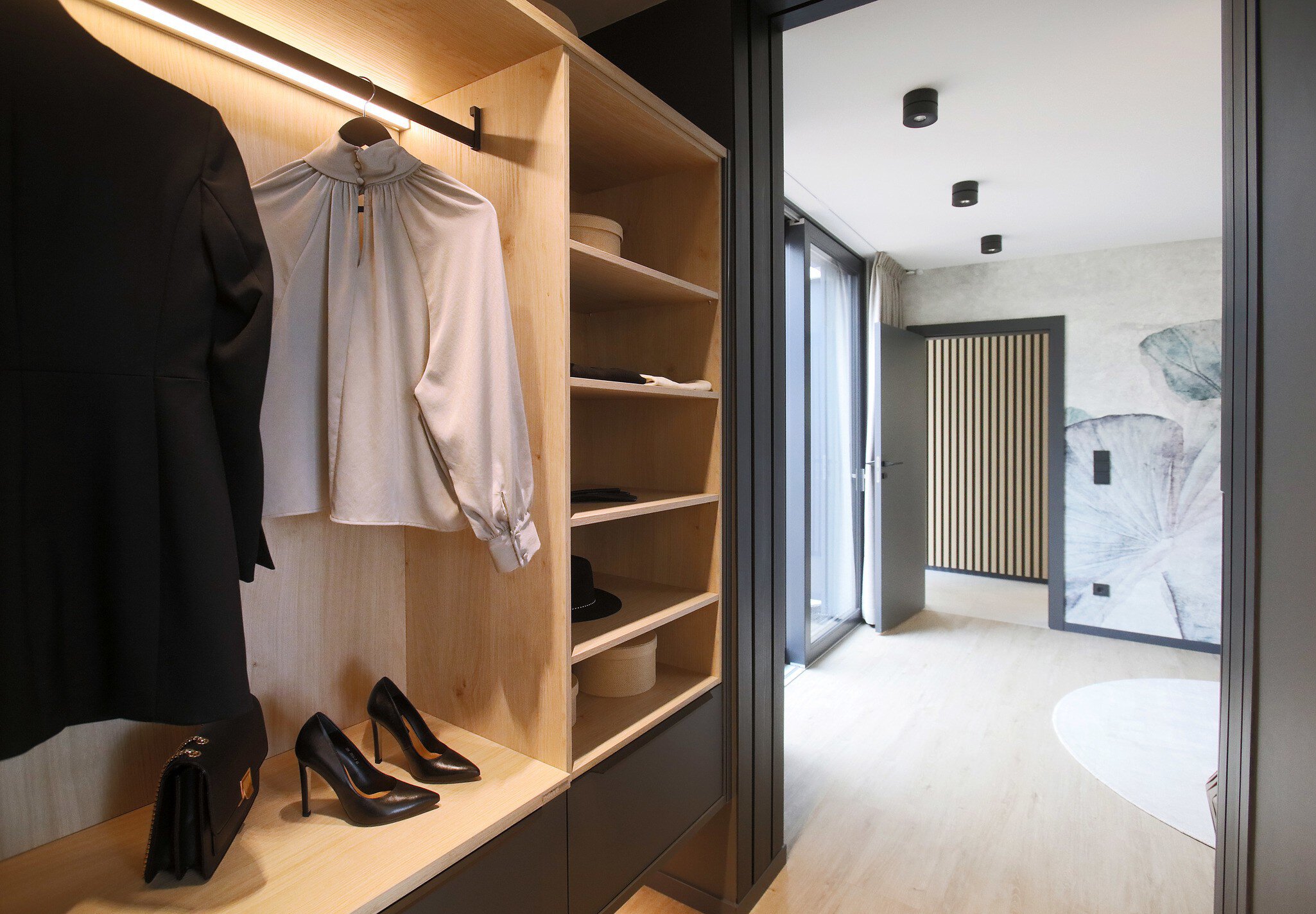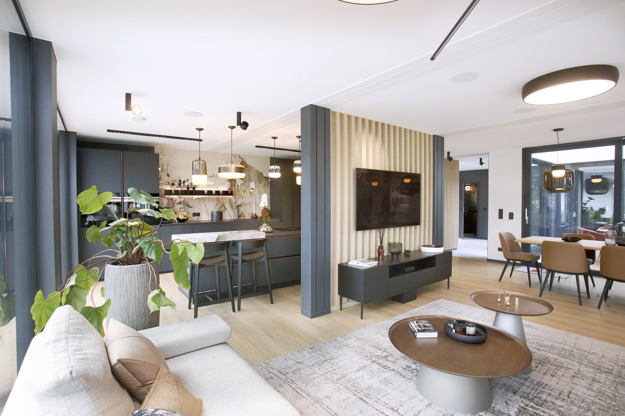 Das Musterhaus Next by Danwood in Poing zeigt, welchen Ansprüchen an Design, Komfort und Energieeffizienz ein solches modular gefertigtes und einzugsfertiges Einfamilienhaus von Danwood gerecht wird. Der Innenausbau folgt aktuellsten Trends. Das gilt für die Küche, die in einem NEXT-Haus (auf Wunsch) voll ausgestattet ist, für Bad und Gäste-WC mit optisch und haptisch schönen Fliesen und eleganten Sanitärobjekten sowie für die außergewöhnlich hellen Wohnräume, die mit Vinylböden, exklusiven Tapeten und modernen Holzlamellen-Elementen ausgestattet sind.