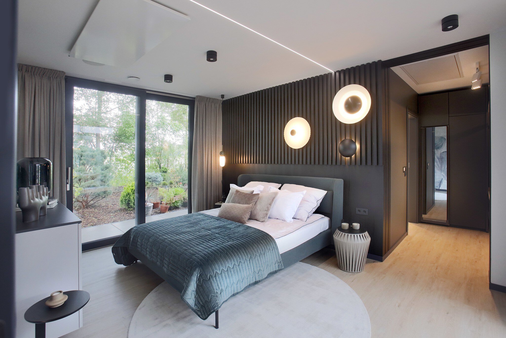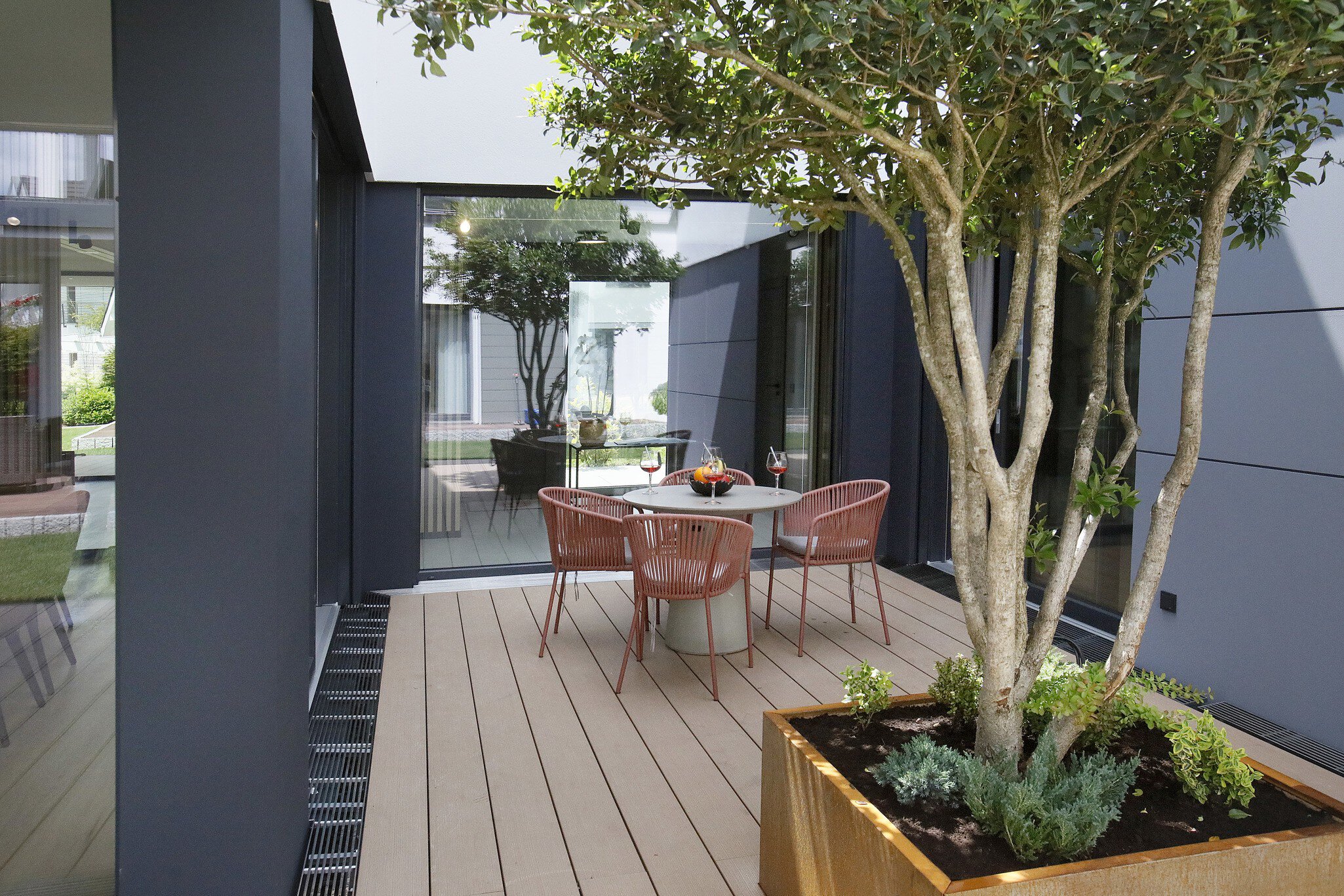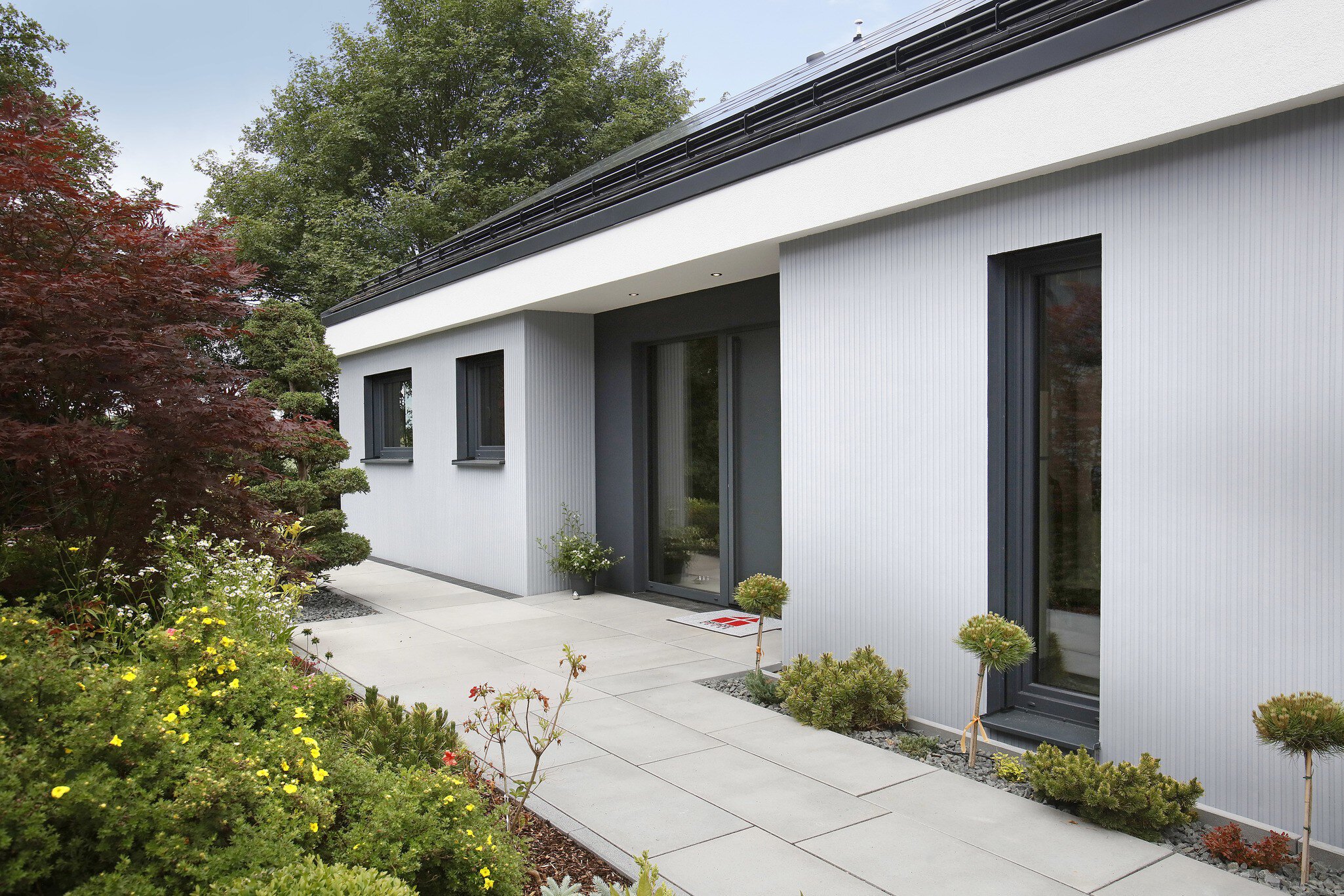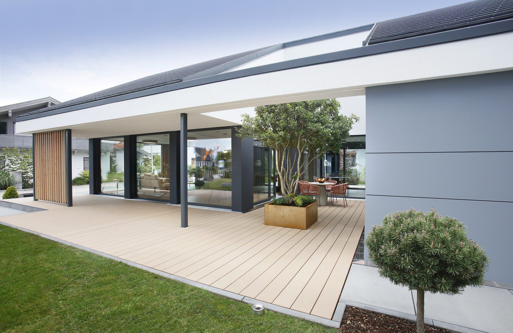 Die Fassade kombiniert glatten und strukturierten Putz mit Faserzementplatten in unterschiedlichen Färbungen – eine elegante Darstellung der Gestaltungsmöglichkeiten. Die farbliche Beschränkung auf Weiß, Grau und Anthrazit fällt wohltuend ins Auge. Das überstandlose Satteldach passt sich in Farbe und Design an und schützt auch den zurückgesetzten Eingangsbereich sowie die Terrasse, wo es durch eine semitransparente Wand aus Holzlamellen gestützt wird. Ein ungewöhnlicher Blickfang ist der Dacheinschnitt über dem kleinen Patio, der für den darin wachsenden Olivenbaum genügend Licht und Höhe bietet und Sonnenstrahlen den Weg zum windgeschützten Freisitz weist.