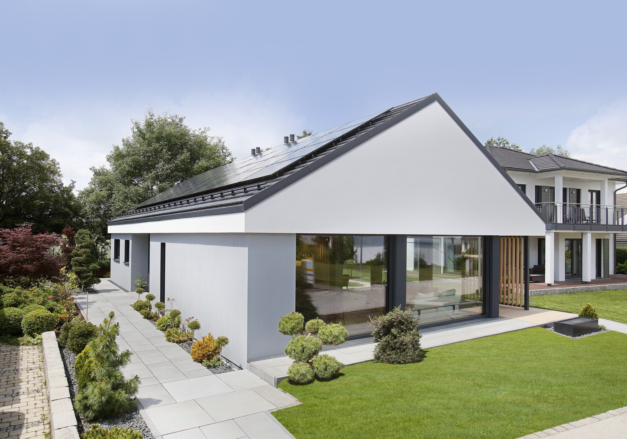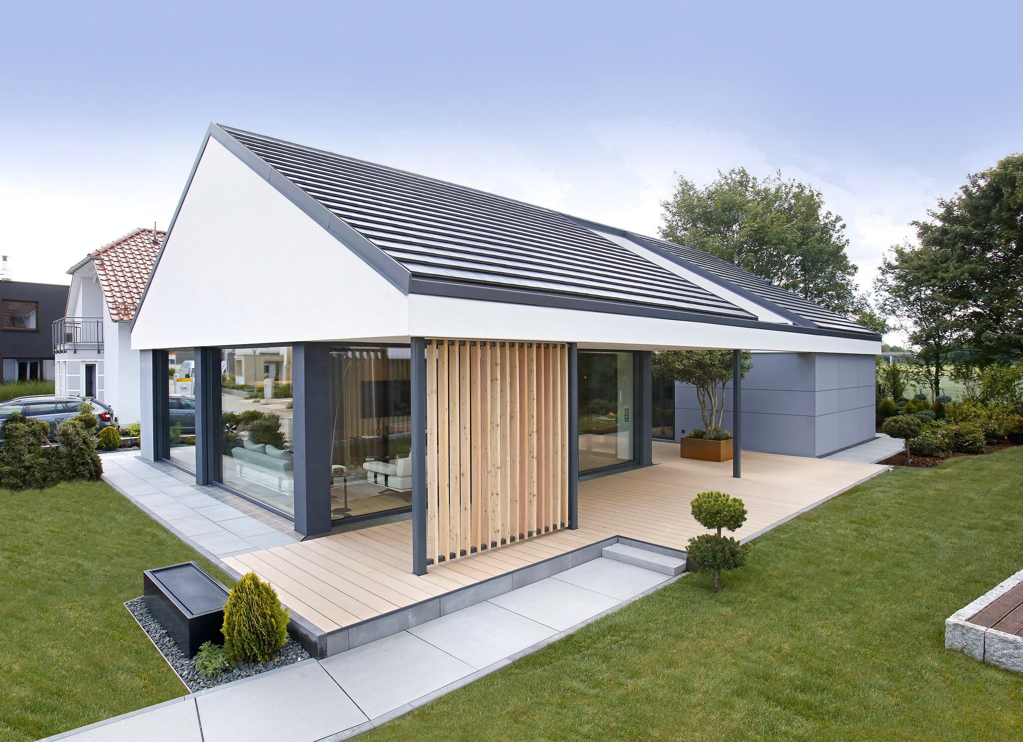 Danwood baut seine NEXT-Häuser als Flach- oder Walmdach. Das Musterhaus in München-Poing beweist die Anpassung an die örtlichen Gegebenheiten und wurde mit einem Satteldach gekrönt. Das ist natürlich auch für jeden Bauherren möglich, z.B., wenn es die Bauvorschriften erfordern.