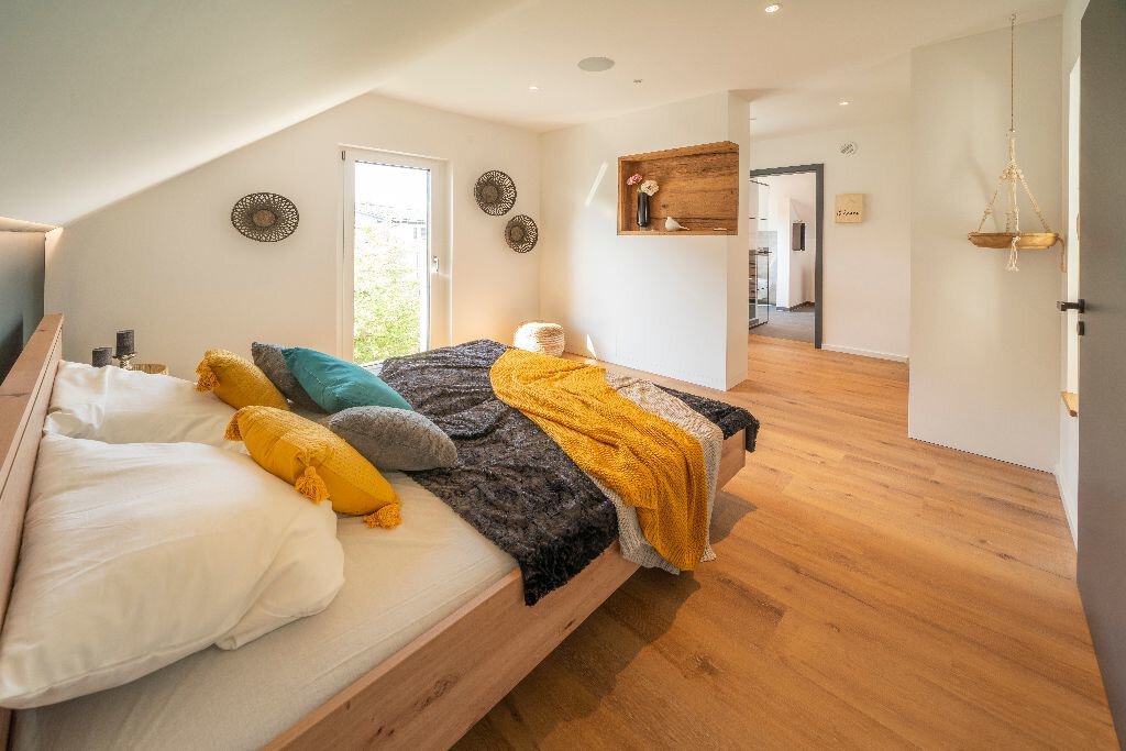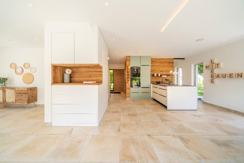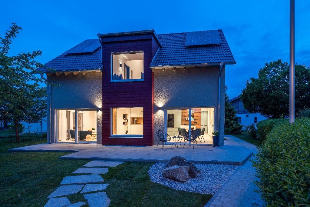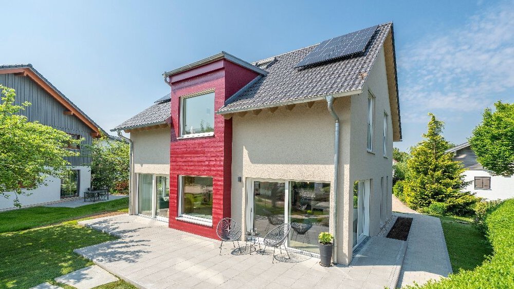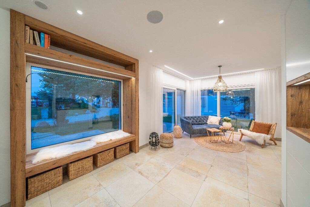 FischerHaus hat deshalb einige entscheidende Vorteile zu einer intelligenten Gesamt-Lösung kombiniert. Erstes Element ist die hervorragende energiesparende Gebäudehülle von FischerHaus. Als zweite Komponente entfaltet das smarte, Haus umfassende „Loxone“ Energiemanagement seine Wirkung. Online werden Wetterdaten verarbeitet, um vorrausschauend die Energien dahin zu lenken, wo Sie später gebraucht werden.Drittens: Die leistungsstarke Photovoltaikanlage speist diese Energie an der Unterseite des Estrichs ein. Der Fußboden wird so zum Masse-Speicher. Und zwar phasenverschoben: Das heißt, wenn die Sonne draußen bereits schwächer wird, gibt der Boden die Energie in der vorberechneten Zeitspanne an den Raum ab.