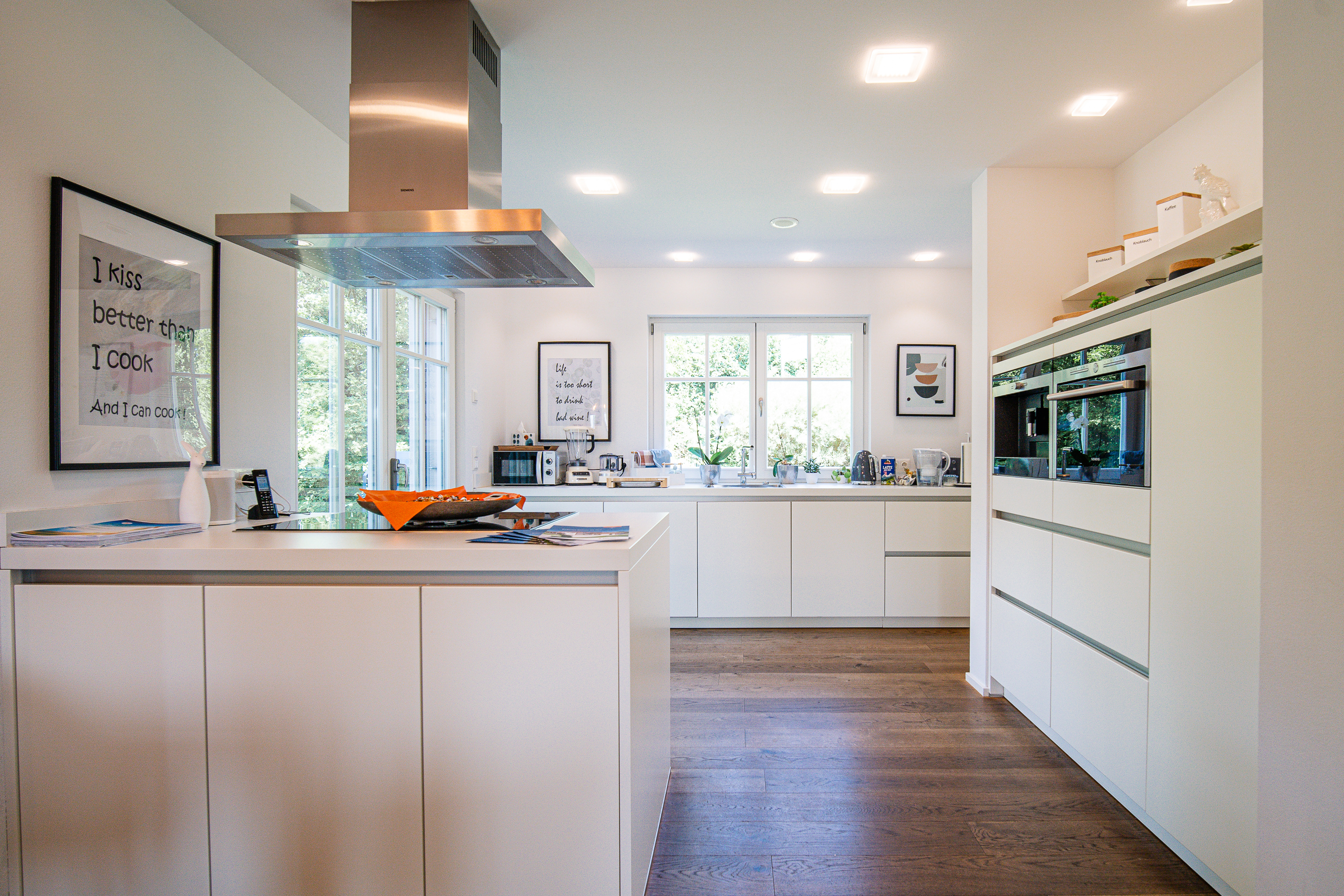 Im Fertighaus empfängt den Besucher moderne Klarheit und Offenheit. Schon beim Schritt durch die Haustüre kann er seinen Blick über die Diele und den Wohn-/Essbereich bis nach draußen schweifen lassen. Flexibilität erhält das Haas MH Poing 187 dadurch, dass es auf Wunsch mit klassischem Satteldach oder modernem Flachdach umgesetzt werden kann.