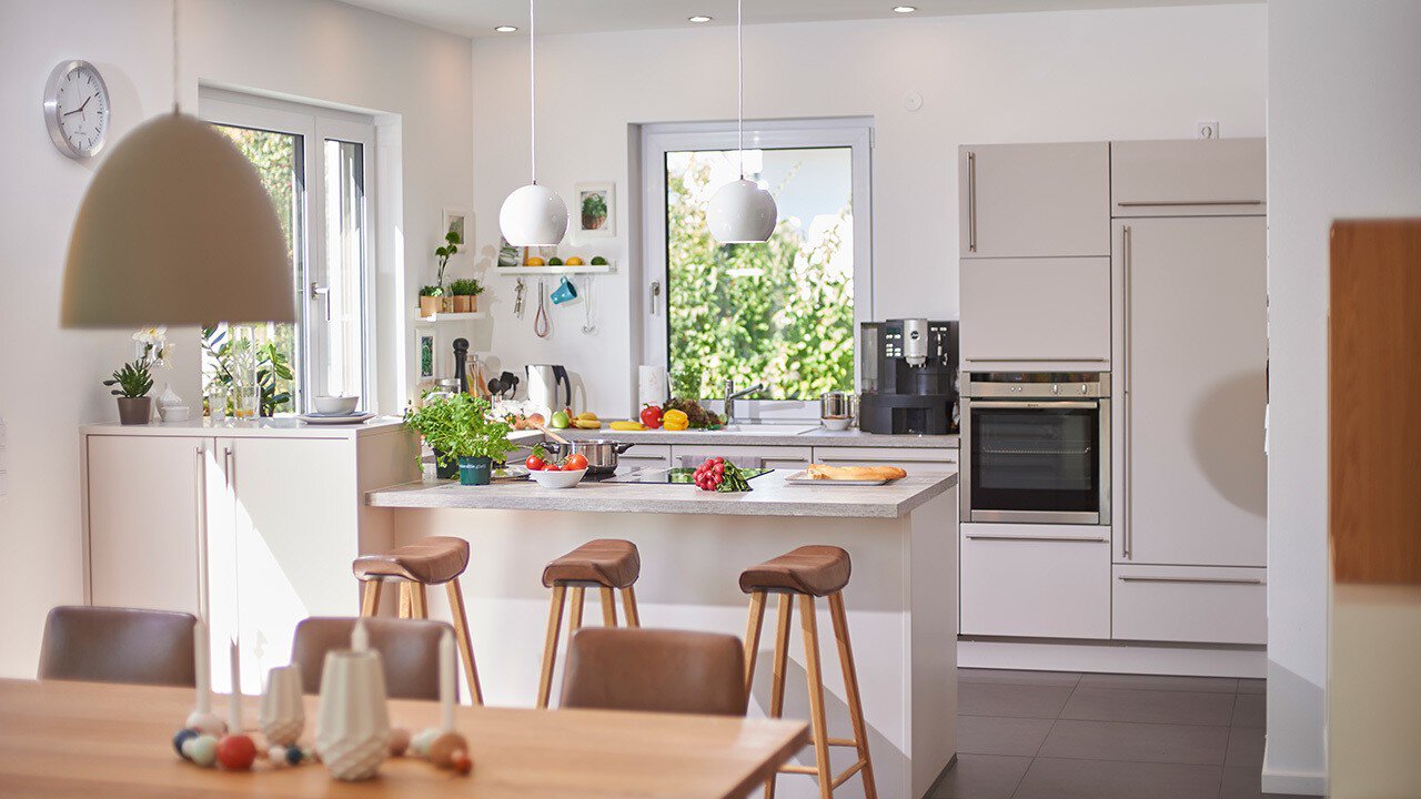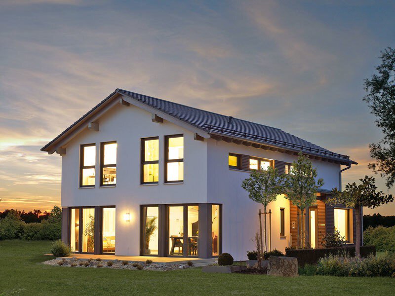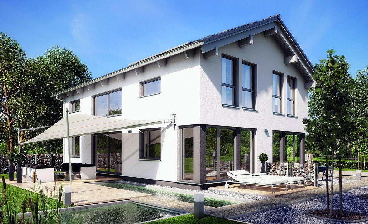 Das Musterhaus Variant 25-192 in München-Poing ist eine moderne Interpretation der klassischen (ober-) bayerischen Bauform. Aber nicht nur dort macht diese Architektur eine gute Figur: Mit seinem 2 m hohen Kniestock und dem flachen 25°-Satteldach ist der Entwurf ideal für Gegenden geeignet, in denen Baugrund teuer ist und dennoch, auch ohne Keller, viel Wohnfläche geschaffen werden soll. Auf mehr als 190 m2 finden neben dem offenen Wohn-, Ess- und Kochbereich mit Speisekammer, einem Arbeits- oder Gästezimmer mit Dusch-Bad auch zwei Kinderzimmer mit separatem Bad, ein Elternschlafzimmer mit eigener Ankleide und Wellness-Bad ihren Platz. Und wird – jetzt oder auch erst später – ein Raum mehr benötigt, kann die Galerie im Obergeschoss zu einem weiteren Zimmer umfunktioniert werden.