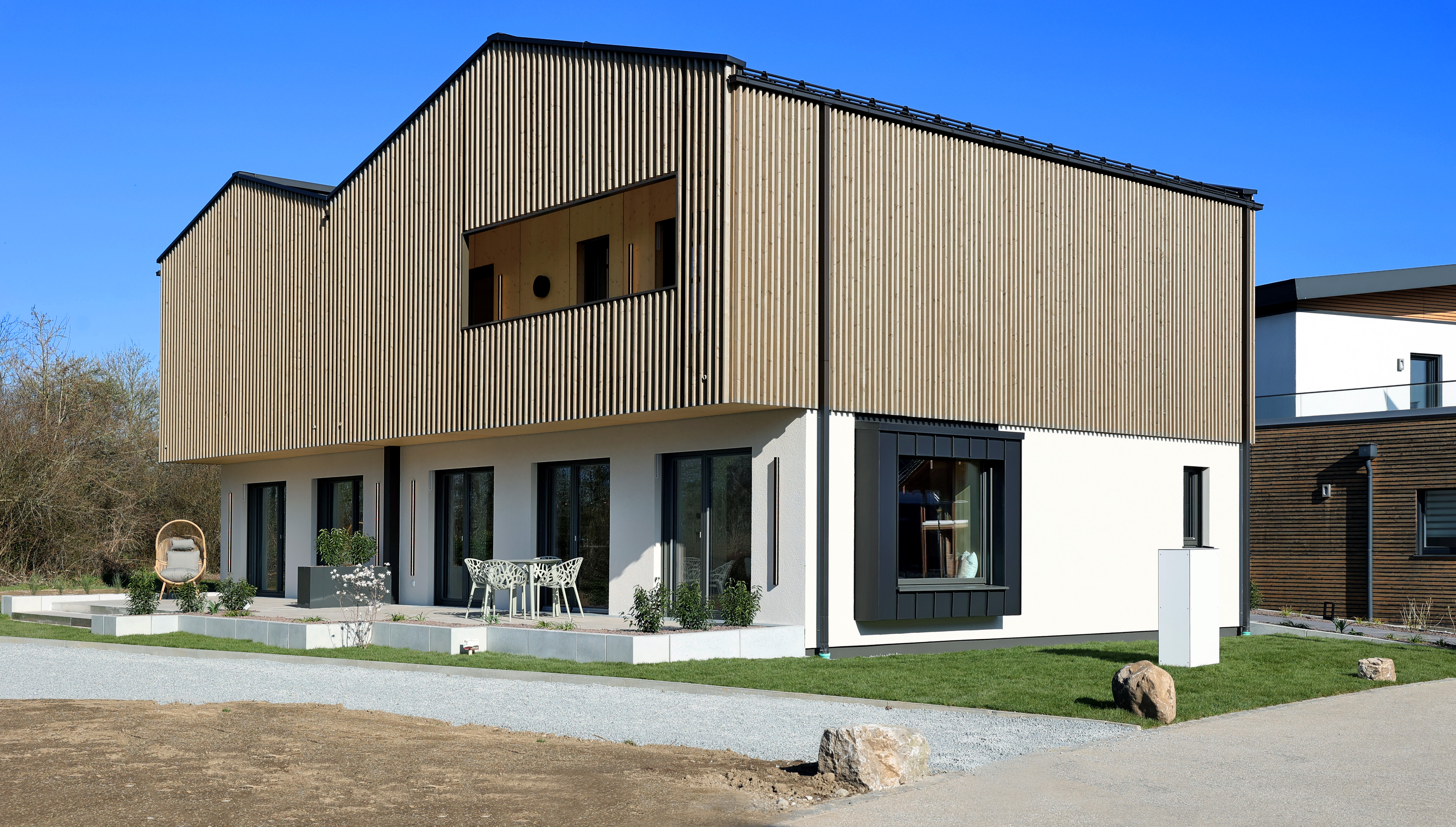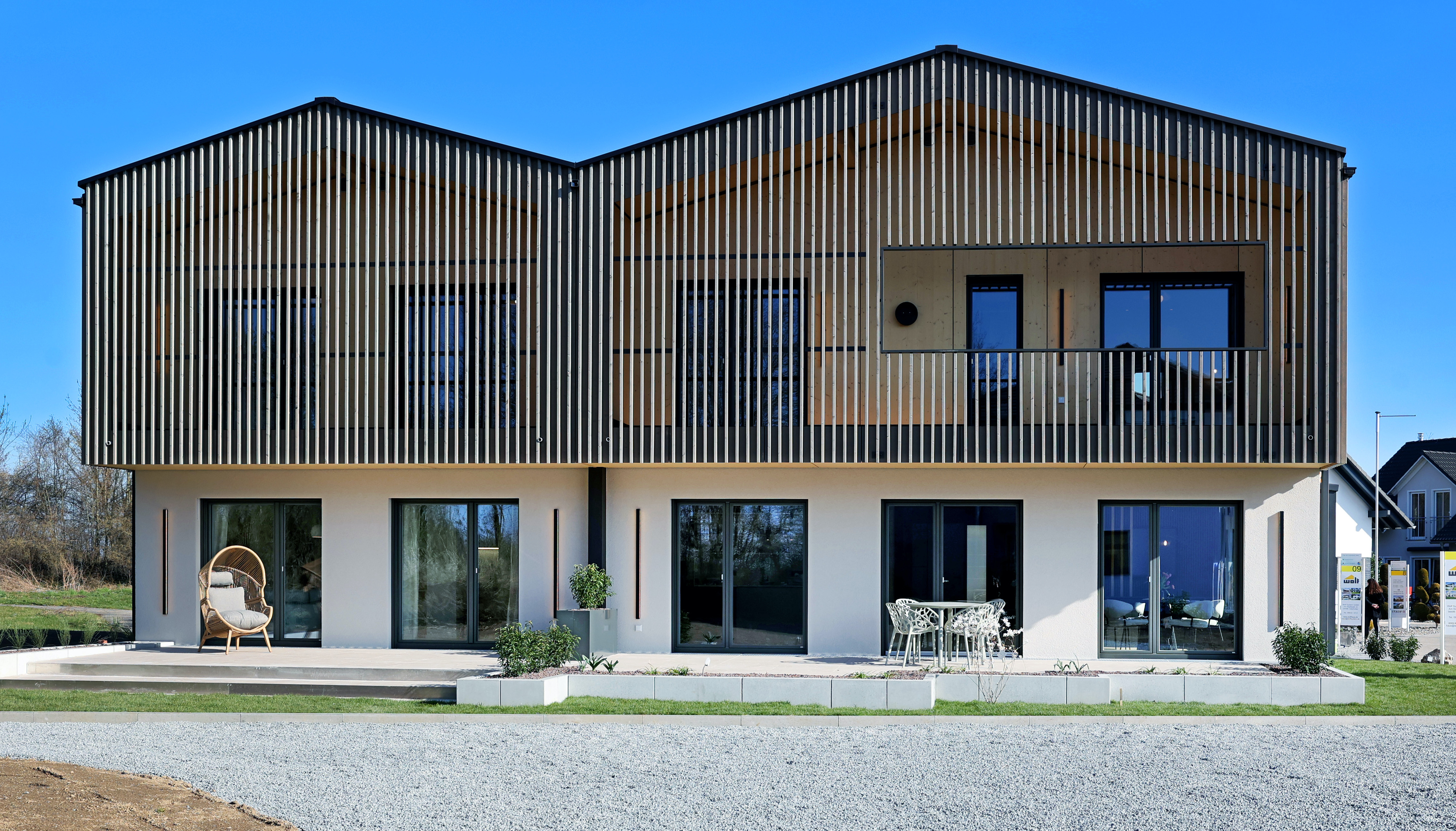 Vorgegraute Holzlamellen, klare Linien und sanft geneigte Satteldächer sorgen für einen modernen, natürlichen Look. - Nachhaltiger Fertigbau: