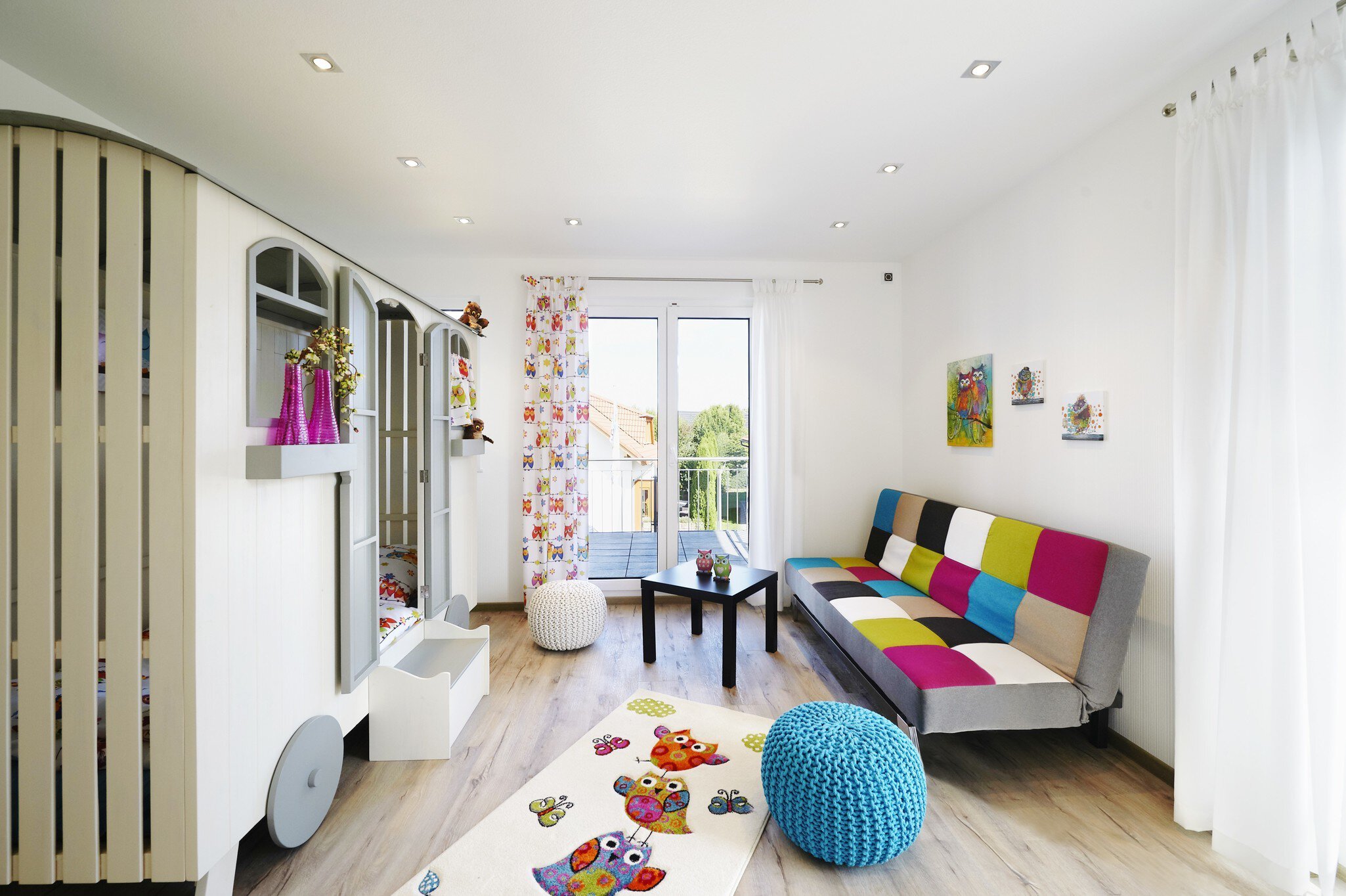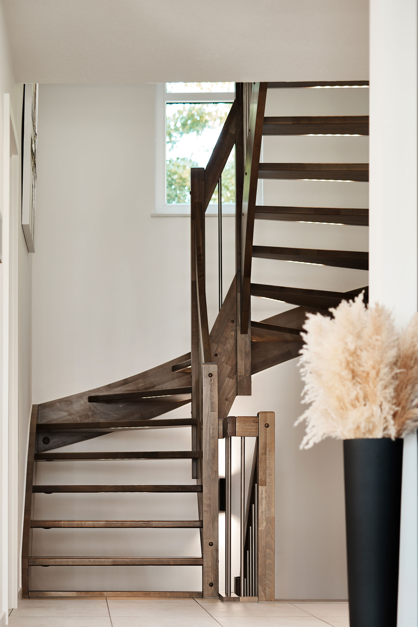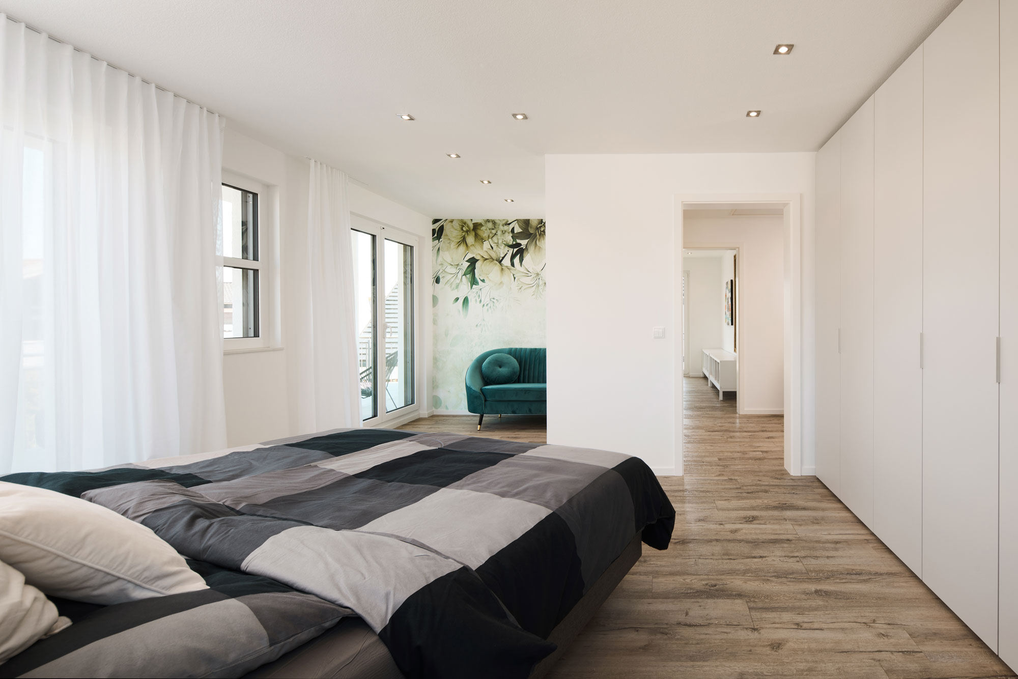 Im Obergeschoss befinden sich zwei Kinderzimmer, das Elternschlafzimmer mit Ankleidebereich und das Familienbad.