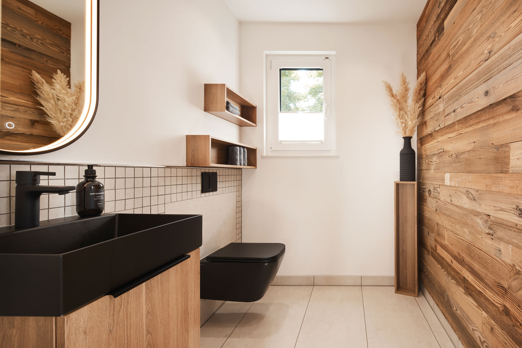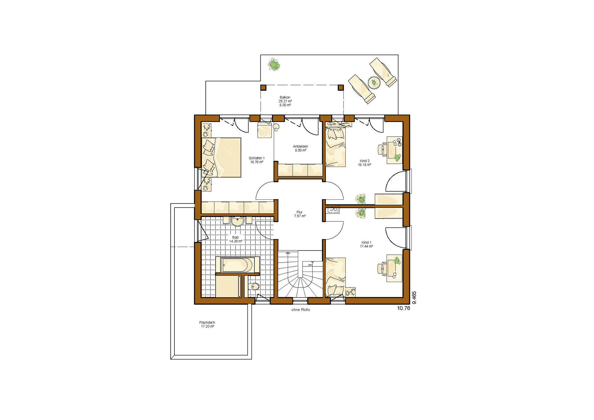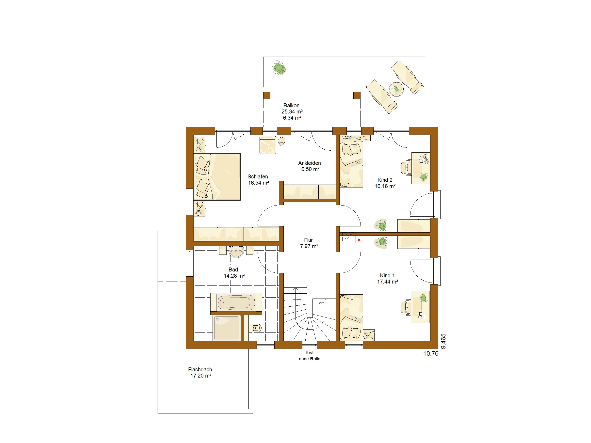 Im Obergeschoss befinden sich zwei Kinderzimmer, das Elternschlafzimmer mit Ankleidebereich und das Familienbad.