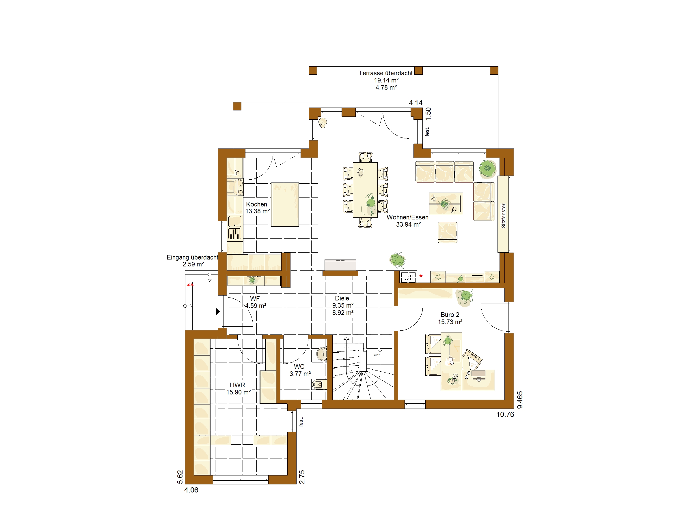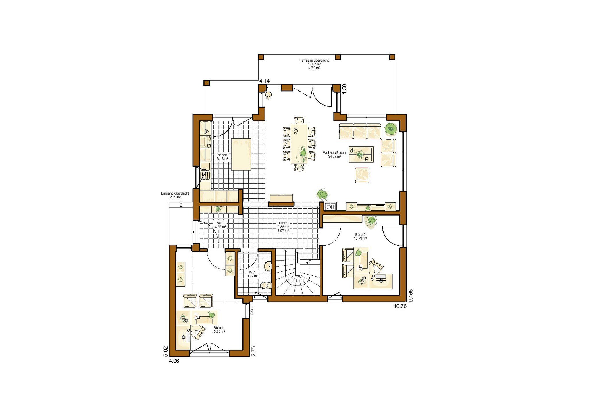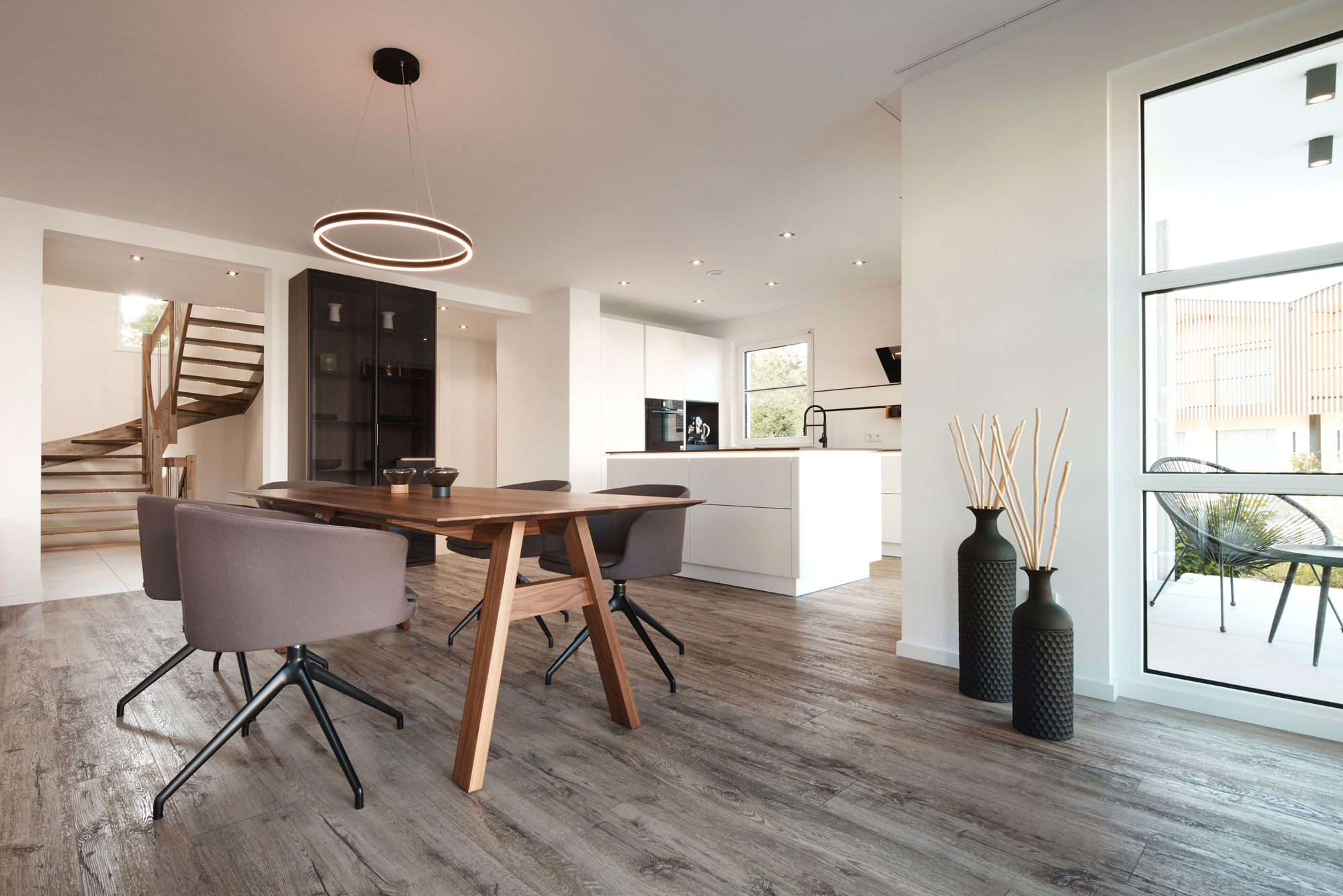Der große Wohn-Essbereich und die nahtlos angrenzende Küche bieten Zugänge zur Terrasse. Der separate, eingeschossige Anbau ermöglicht ungestörte Büroarbeit. Ein zusätzliches Büro im Erdgeschoss kann auch anderweitig, zum Beispiel als Gästezimmer, genutzt werden.