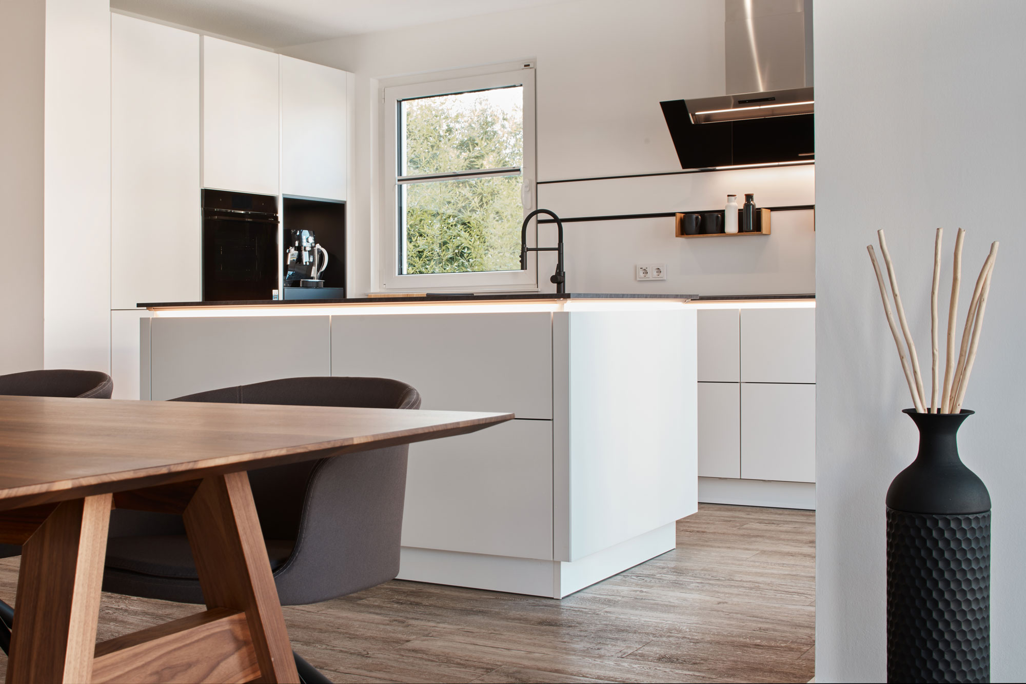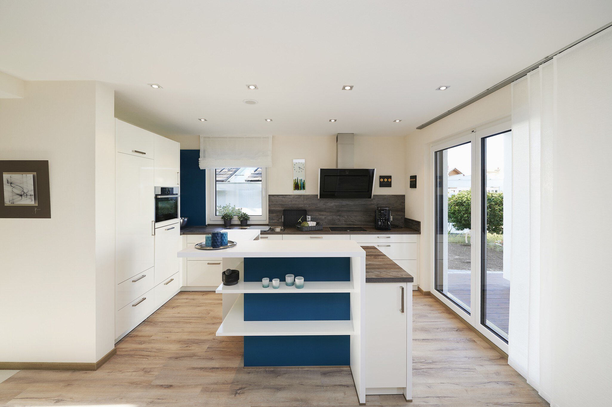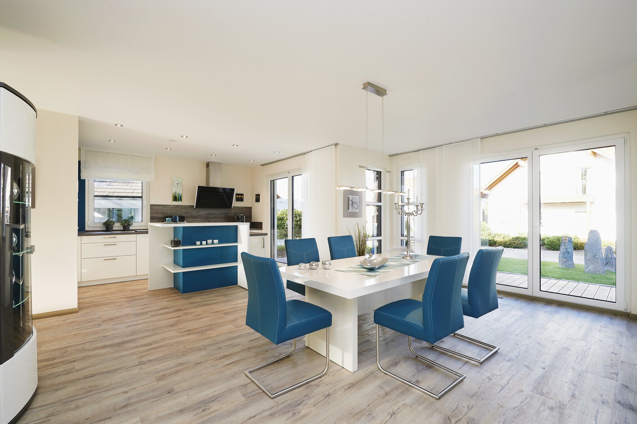 Der große Wohn-Essbereich und die nahtlos angrenzende Küche bieten Zugänge zur Terrasse. Der separate, eingeschossige Anbau ermöglicht ungestörte Büroarbeit. Ein zusätzliches Büro im Erdgeschoss kann auch anderweitig, zum Beispiel als Gästezimmer, genutzt werden.