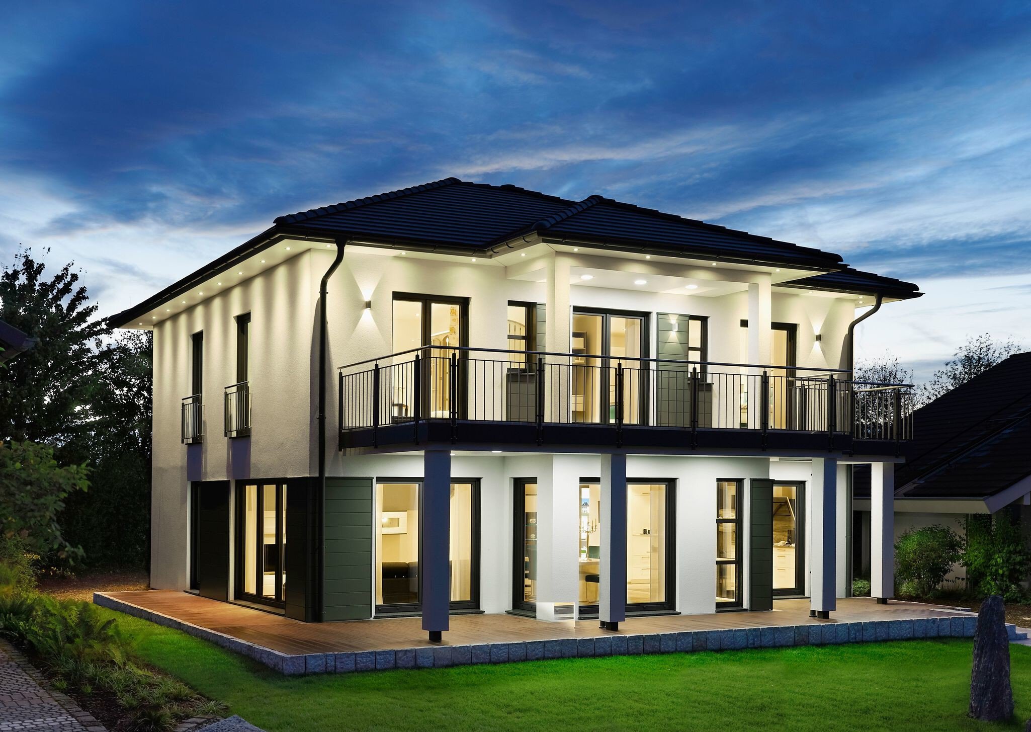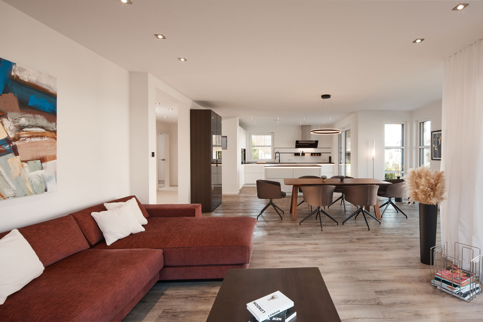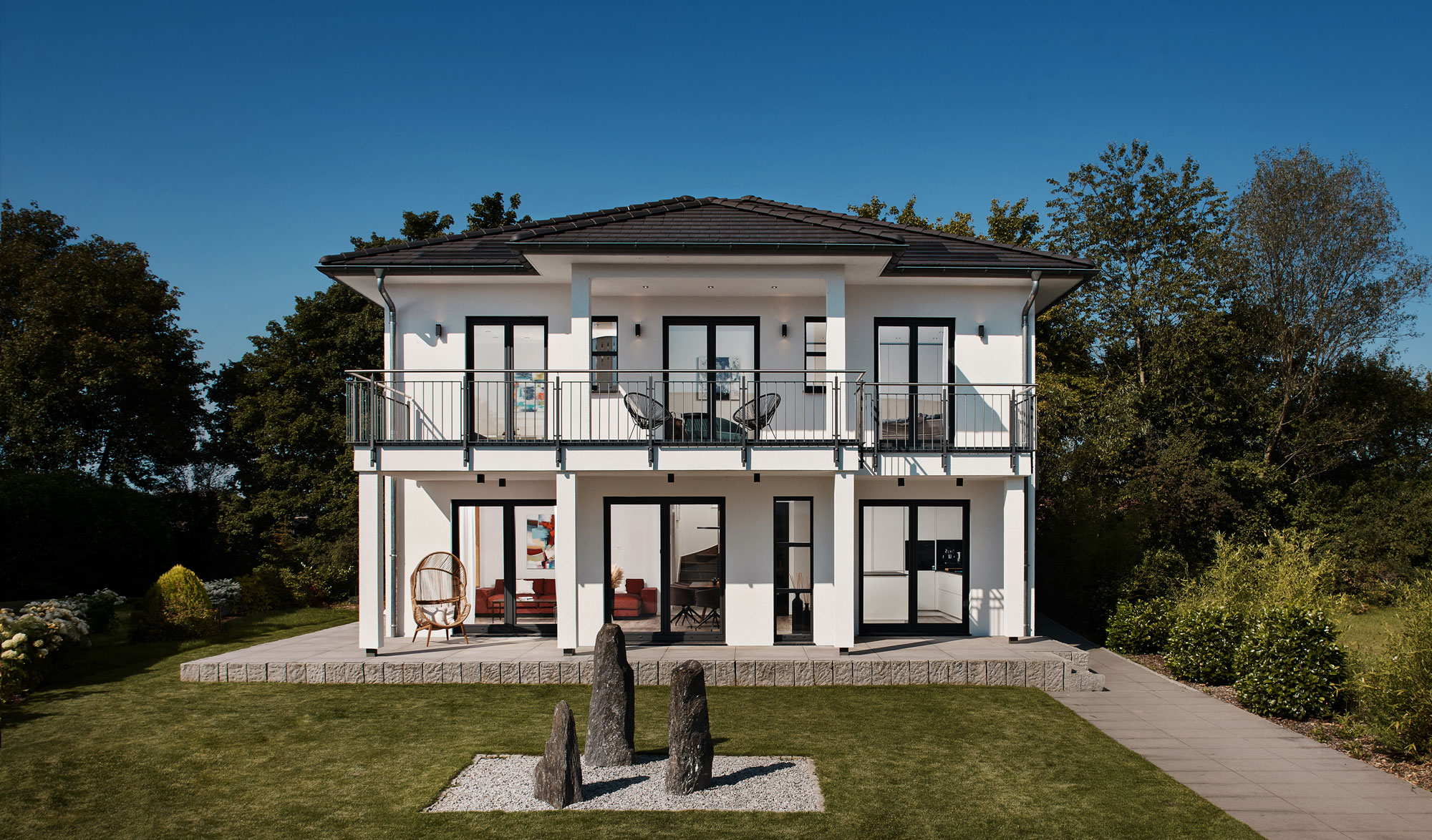 Klare Formen und kubische Elemente unterstreichen den markanten Charakter der Stadtvilla Montana.An der strahlend weißen Fassade setzen dunkle Applikationen wirkungsvolle Akzente und betonen die großzügigen Verglasungen, die dem Innenleben des Hauses eine moderne, helle und freundliche Atmosphäre verleihen.