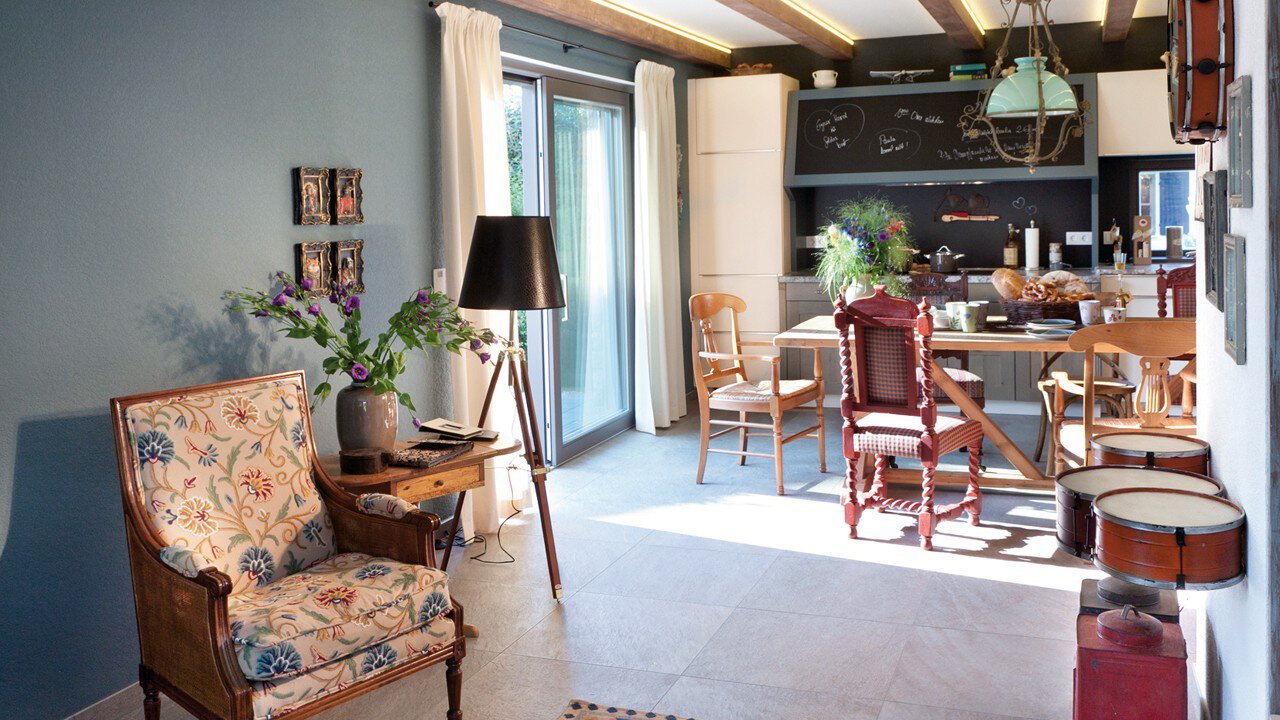 Die große Diele lässt sich ebenso auf das traditionelle Landhaus zurückführen wie die vom Wohnbereich separierbare Wohnküche mit Speisekammer und Kochinsel. Bezeichnendes Merkmal ist die durchgängige Großzügigkeit mit Gästebereich plus zwei Bädern und Ankleide im OG.