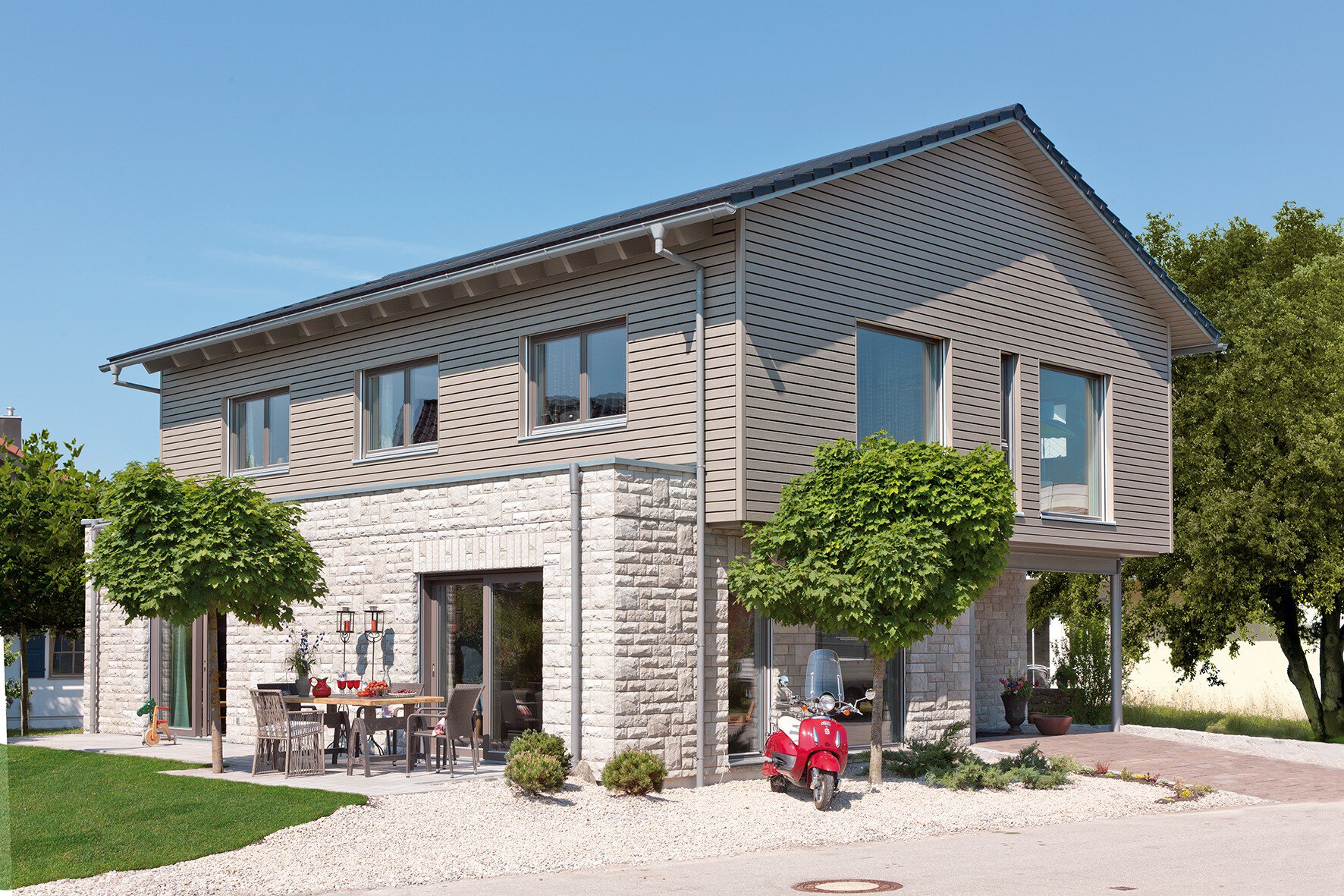 Mit einer Schwörer Steinfassade im EG und der Holzlamellenfassade im OG nimmt das Haus Elemente des regionalen Baustils auf, neu interpretiert durch moderne Fensterformate und ein 'Technikdach'.