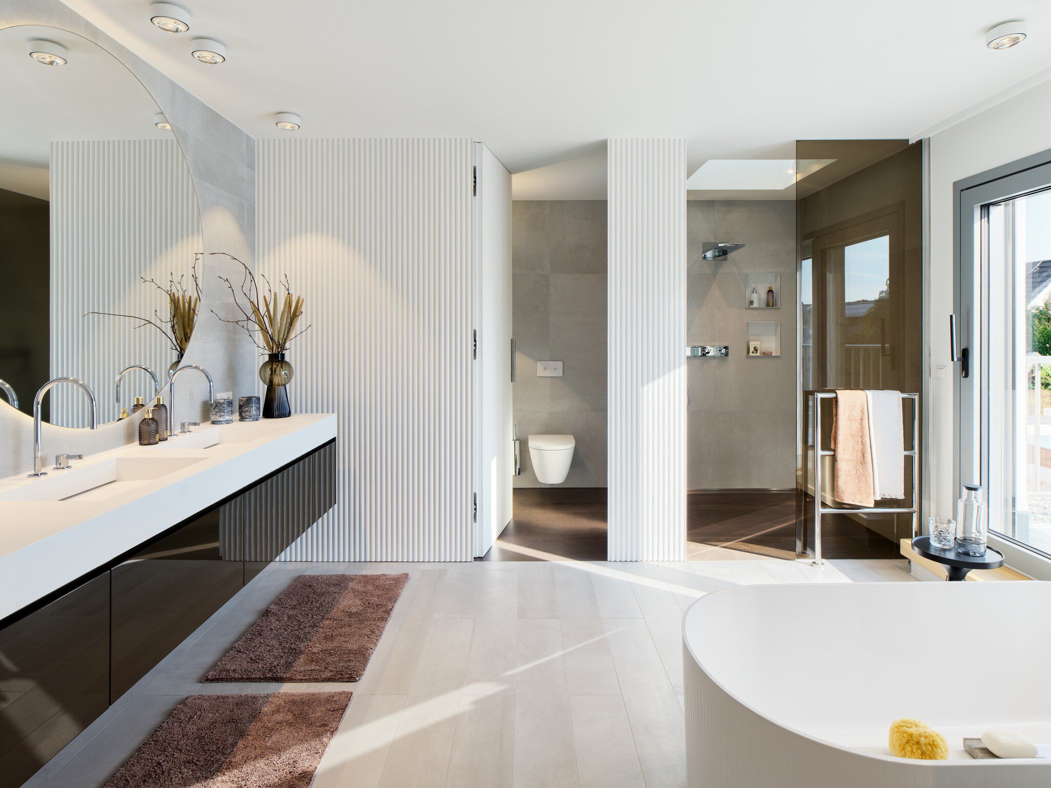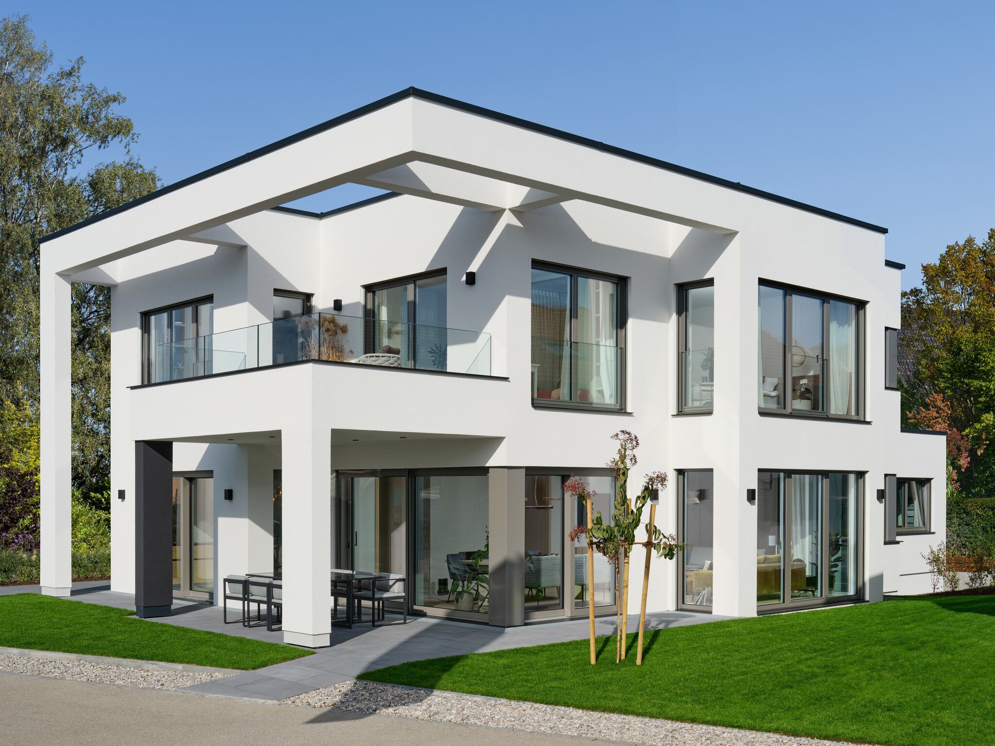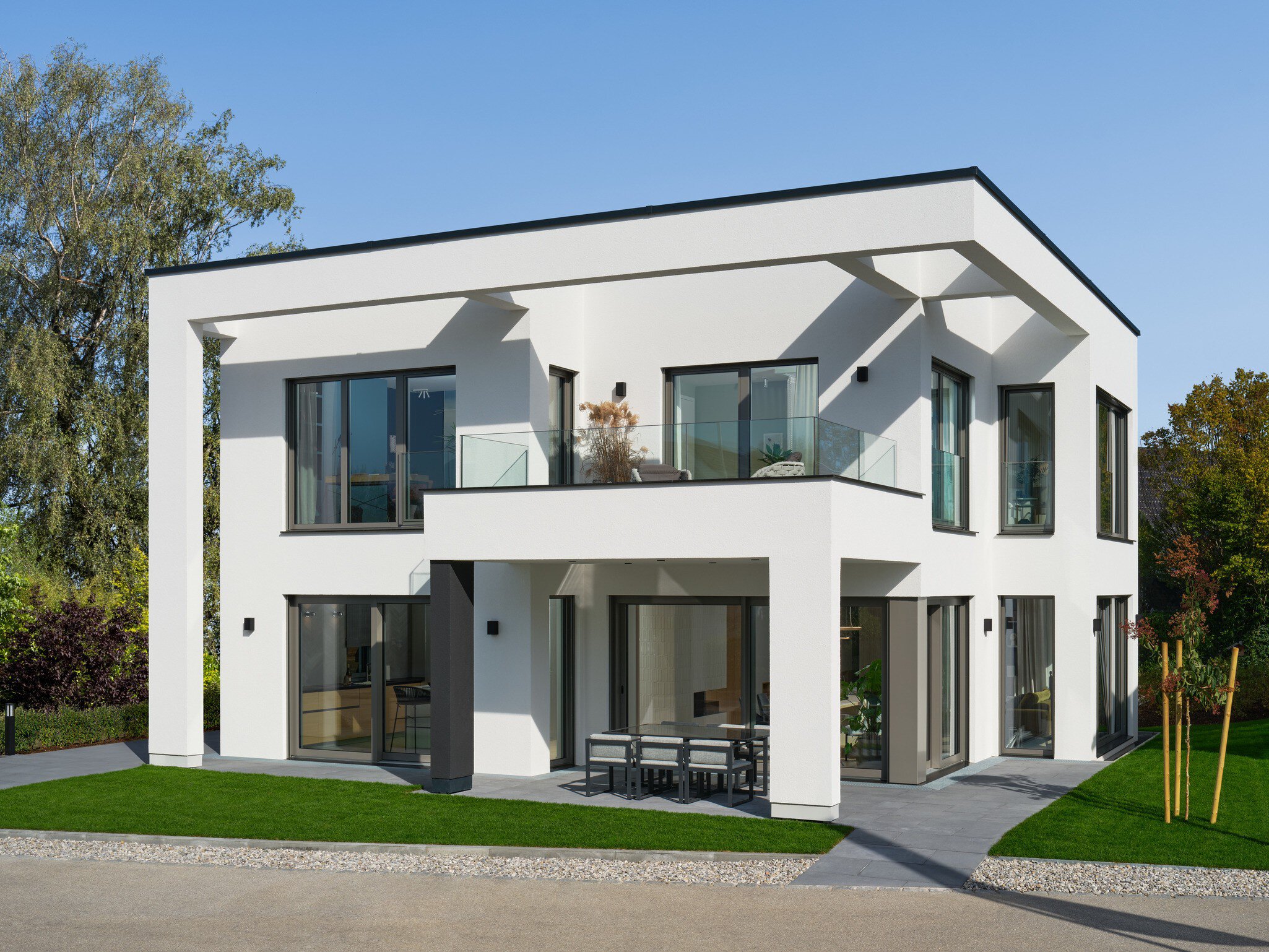 Die moderne Villa wurde von dem Architekten Hamid von Berg-Hadjoudj entworfen und von Villa Projects, einem namhaften Innenarchitekturbüro, weiterentwickelt. Die Basis ist ein klarer, weißer Kubus, der durch auskragende Elemente akzentuiert wird. Für viel Transparenz sorgen großzügige Glasflächen. Die offene Struktur lässt die Grenzen zwischen Innen und Außen verschwimmen. Balkone und Terrassen laden zum Entspannen ein. Eine Doppelgarage grenzt direkt an das Haus an. Die Villa bietet mit über 200 Quadratmetern Wohnfläche großzügigen Raum für Familien oder Paare, die eine offene Architektur wertschätzen. Mit dem frei geplanten Architektenhaus stellt WeberHaus erneut unter Beweis, dass sich modernes Design, Premium-Qualität und eine nachhaltige Holzbauweise keineswegs ausschließen.