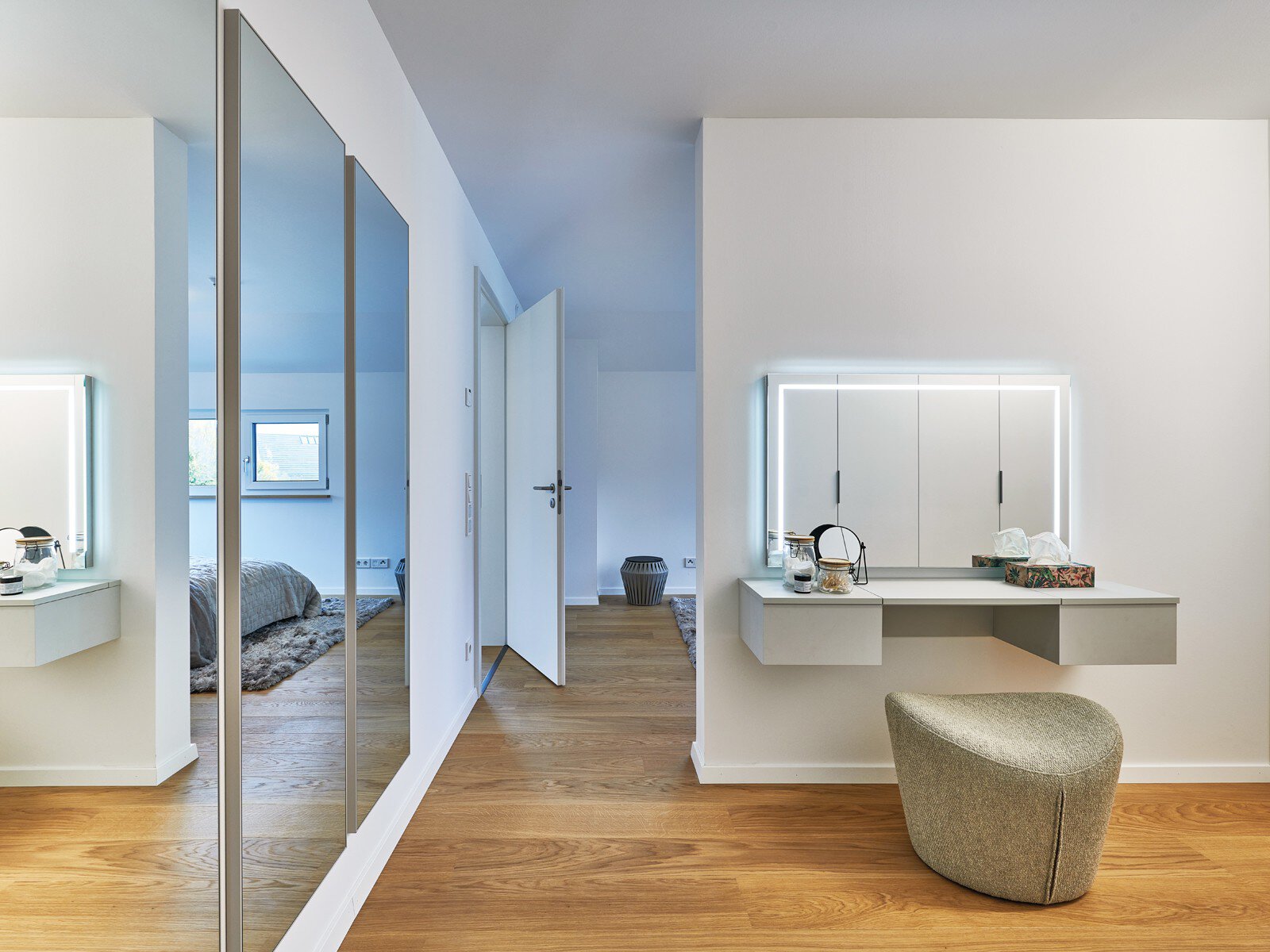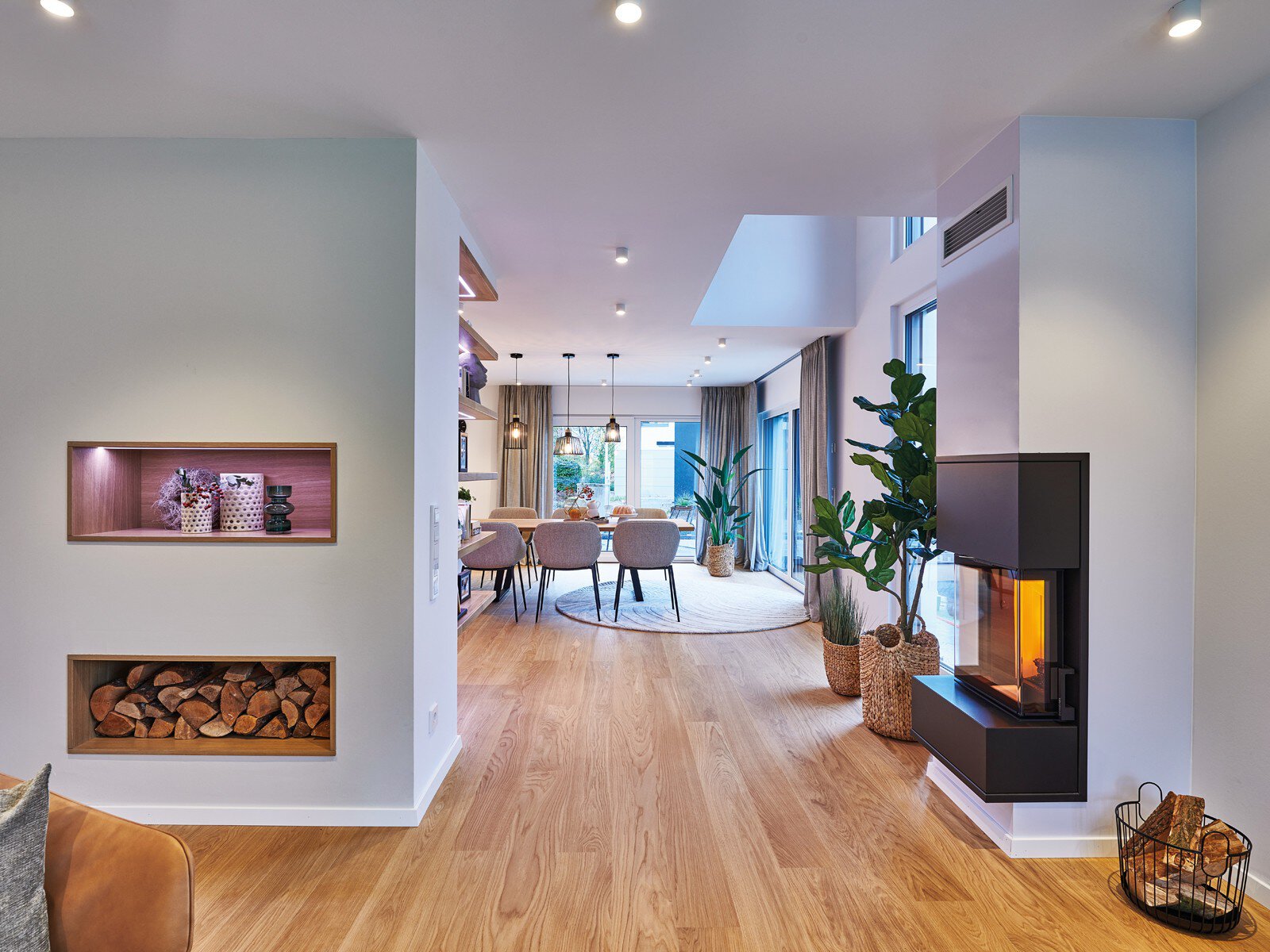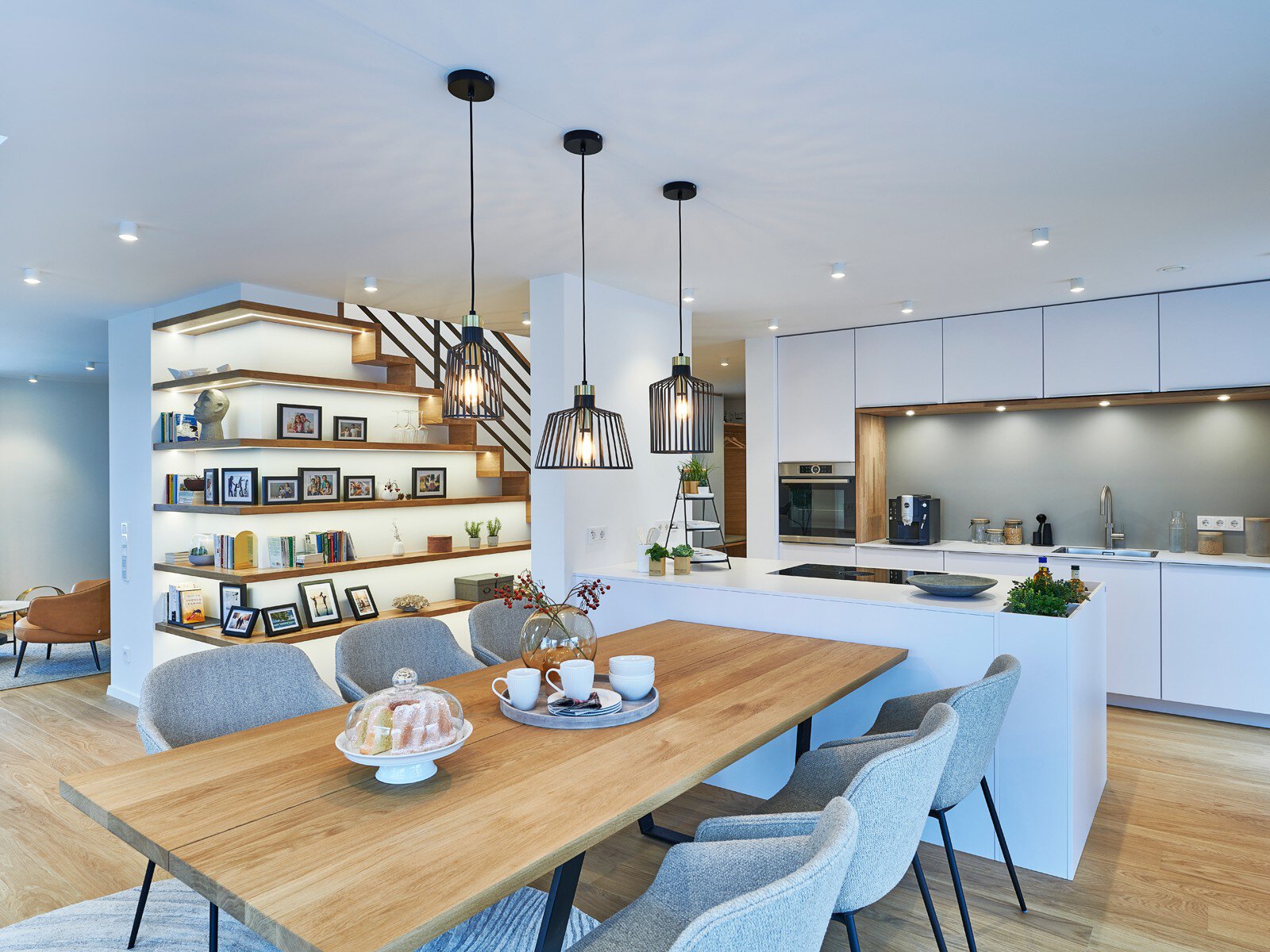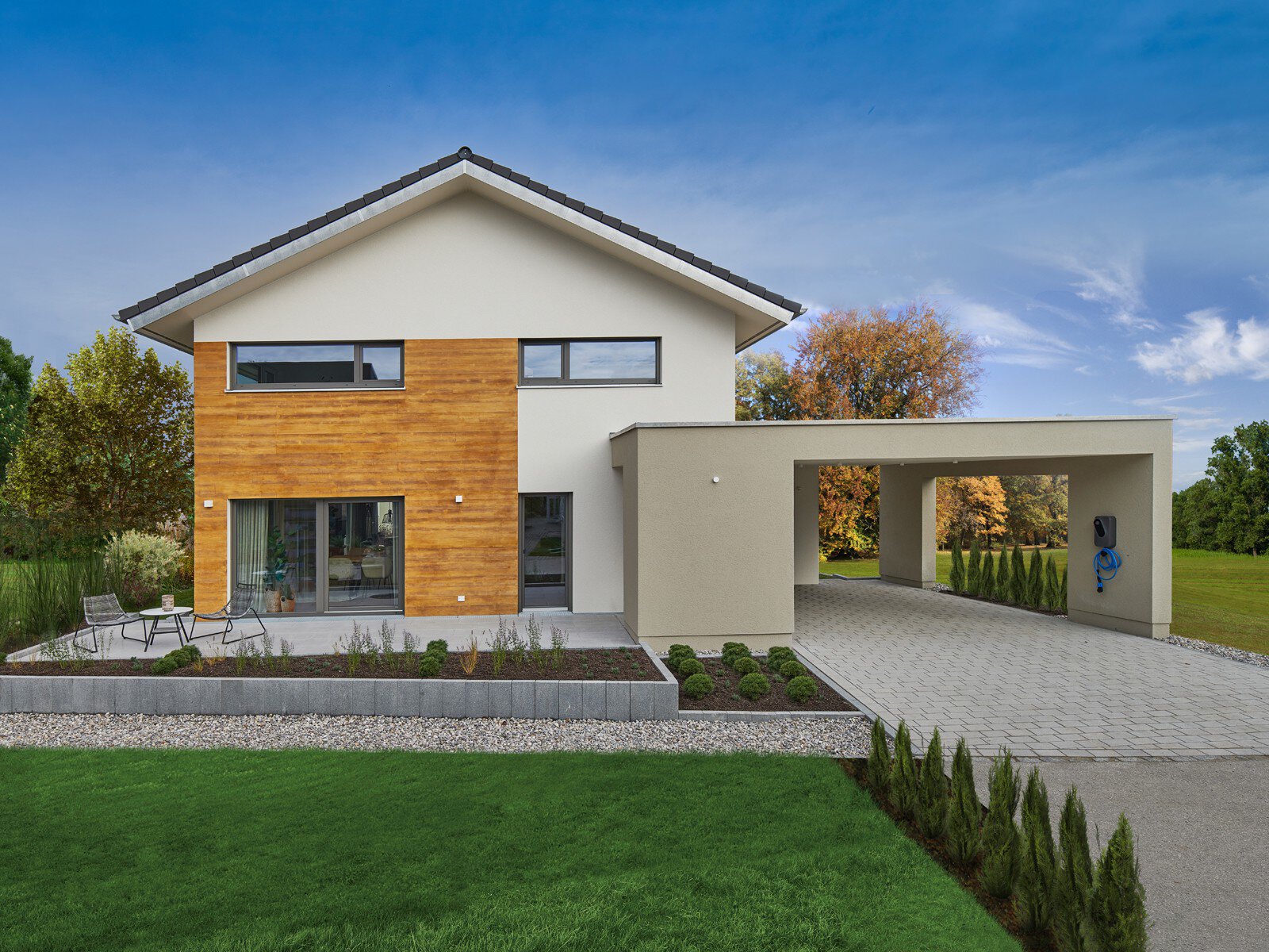 Das neue Musterhaus Poing von Fertighaus WEISS präsentiert einen modernen und flexiblen Grundriss, der Bauherren bis in das hohe Alter begleitet: Familien mit Kindern verfügen mit rund 180 Quadratmetern nutzbarer Bodenfläche über ausreichend Platz und eine gelungene Balance von Gemeinschaft und Individualität. Für das spätere Wohnen auf einer Ebene können ein Duschbad und ein zusätzliches Zimmer im Erdgeschoss genutzt werden. Der Essplatz steht im Zentrum des Hauses und ist in zahlreiche Sichtachsen eingebunden. Dagegen wurde der separierte Wohnbereich als Rückzugsort mit hohem Wohlfühlfaktor gestaltet. Highlights der Innenraumgestaltung des Musterhauses sind die als Möbelstück gestaltete Treppe aus der WEISS-Manufaktur, die an den Außenseiten als Regalfläche genutzt werden kann, sowie der Flur im Dachgeschoss, der dank Galerie und Sitzfenster eine besondere Wohnqualität erhält. Die nachhaltige Holztafelkonstruktion des Hauses wird ergänzt durch eine Photovoltaikanlage mit Batteriespeicher und eine E-Tankstelle. Überdies bietet das Musterhaus Poing den von Fertighaus WEISS gewohnten Komfort und hohe Effizienz bei der Haustechnik: Eingesetzt wurden eine Luft-Wasser-Wärmepumpe, kontrollierte Wohnraumlüftung und Fußbodenheizung sowie ein funkbasiertes, erweiterbares Smart-Home-System. Natürliche und warme Farben bilden beim neuen Musterhaus Poing einen gelungenen Kontrast zum modernen Grau des flachen Satteldaches.