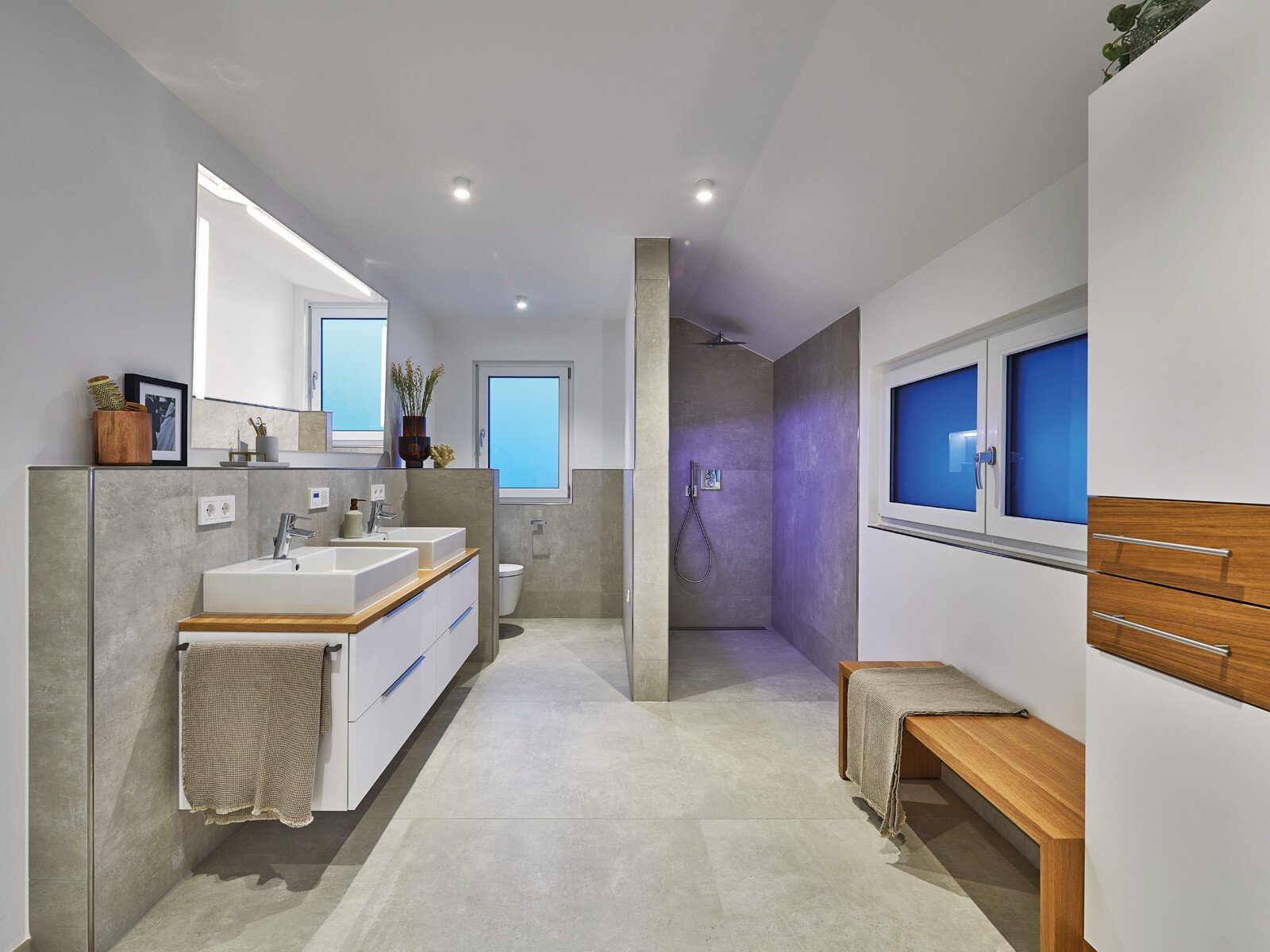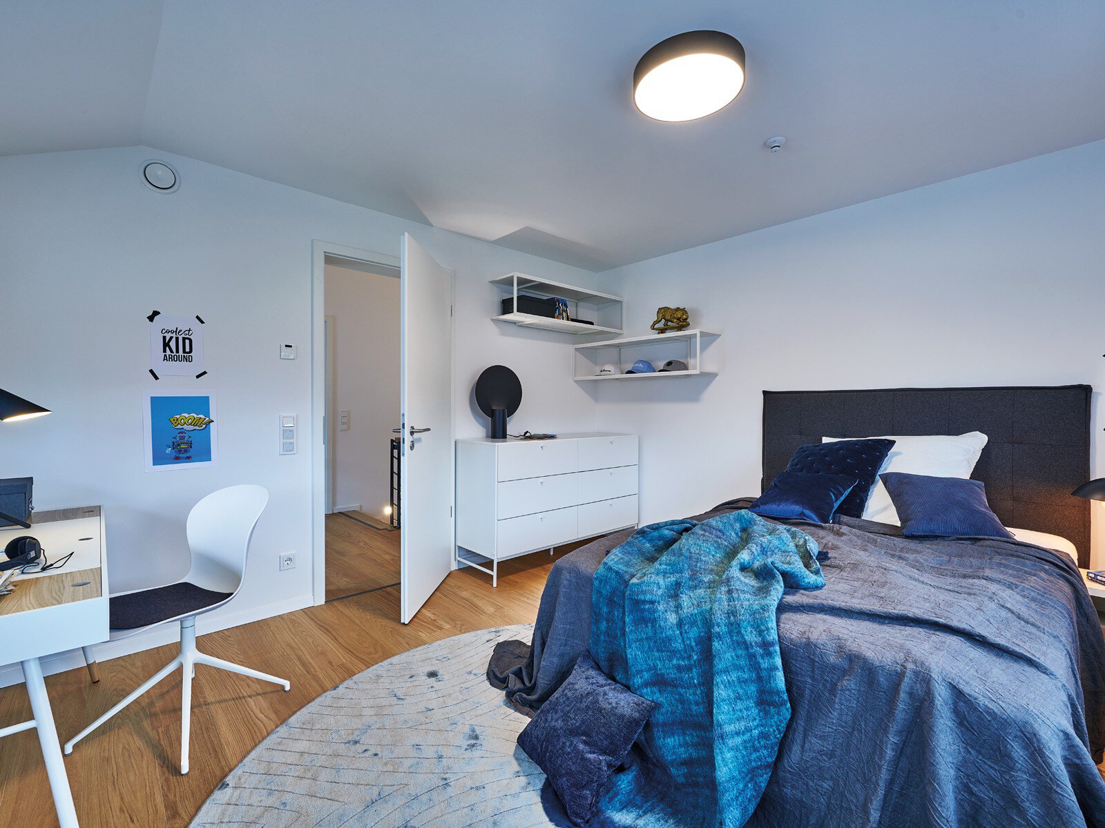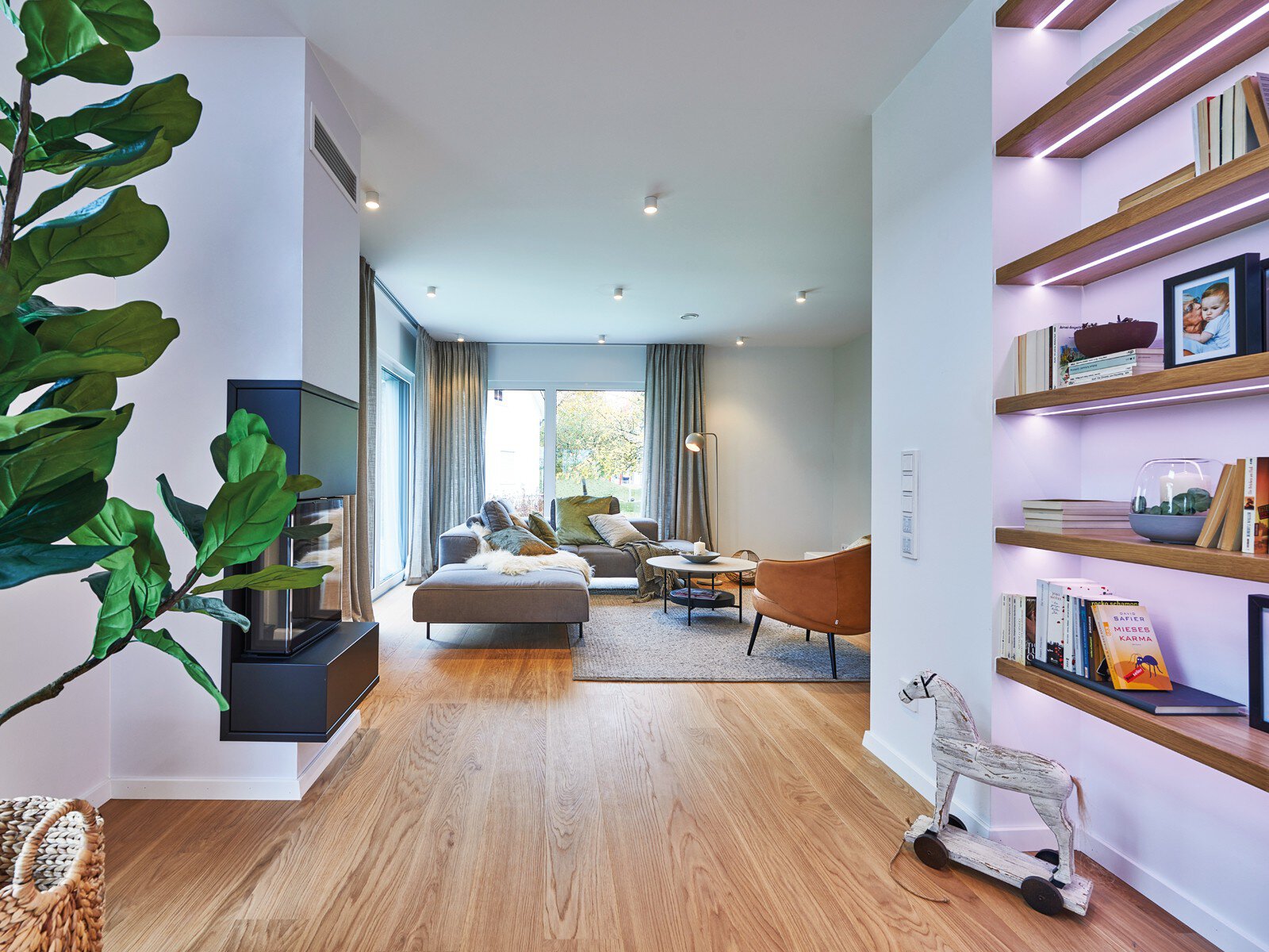 Das neue Musterhaus Poing von Fertighaus WEISS präsentiert einen modernen und flexiblen Grundriss, der Bauherren bis in das hohe Alter begleitet: Familien mit Kindern verfügen mit rund 180 Quadratmetern nutzbarer Bodenfläche über ausreichend Platz und eine gelungene Balance von Gemeinschaft und Individualität. Für das spätere Wohnen auf einer Ebene können ein Duschbad und ein zusätzliches Zimmer im Erdgeschoss genutzt werden. Der Essplatz steht im Zentrum des Hauses und ist in zahlreiche Sichtachsen eingebunden. Dagegen wurde der separierte Wohnbereich als Rückzugsort mit hohem Wohlfühlfaktor gestaltet. Highlights der Innenraumgestaltung des Musterhauses sind die als Möbelstück gestaltete Treppe aus der WEISS-Manufaktur, die an den Außenseiten als Regalfläche genutzt werden kann, sowie der Flur im Dachgeschoss, der dank Galerie und Sitzfenster eine besondere Wohnqualität erhält. Die nachhaltige Holztafelkonstruktion des Hauses wird ergänzt durch eine Photovoltaikanlage mit Batteriespeicher und eine E-Tankstelle. Überdies bietet das Musterhaus Poing den von Fertighaus WEISS gewohnten Komfort und hohe Effizienz bei der Haustechnik: Eingesetzt wurden eine Luft-Wasser-Wärmepumpe, kontrollierte Wohnraumlüftung und Fußbodenheizung sowie ein funkbasiertes, erweiterbares Smart-Home-System. Natürliche und warme Farben bilden beim neuen Musterhaus Poing einen gelungenen Kontrast zum modernen Grau des flachen Satteldaches.