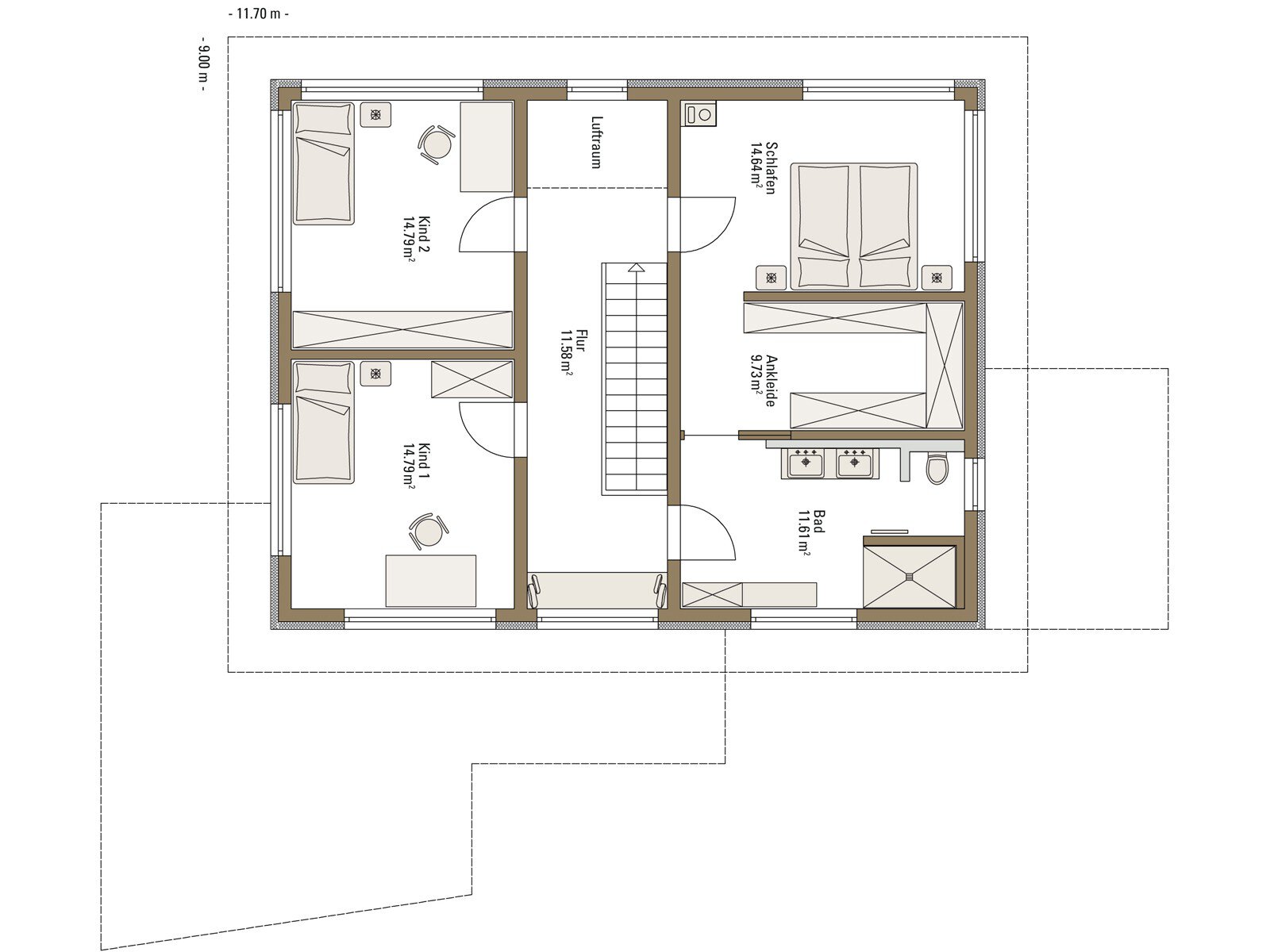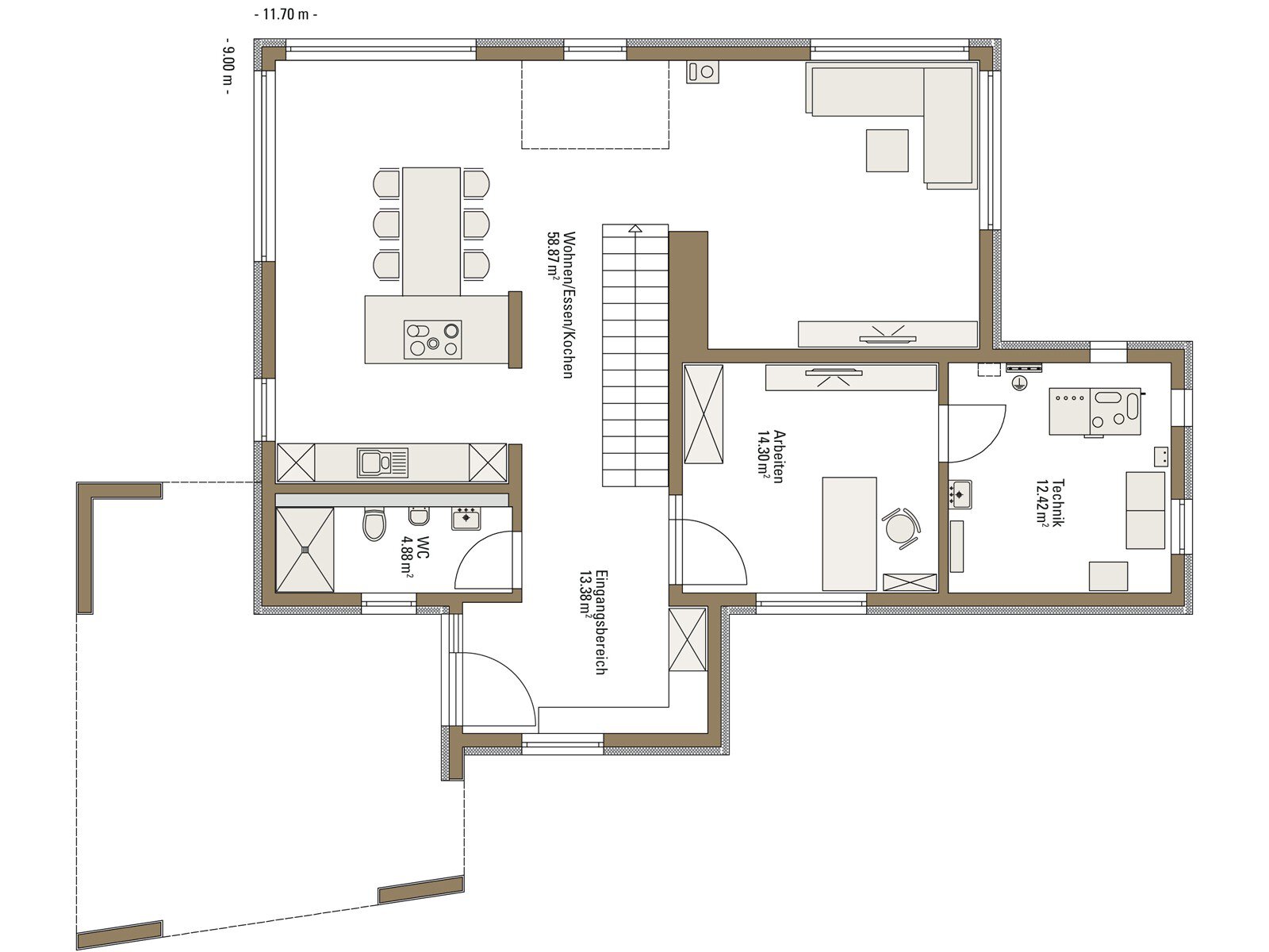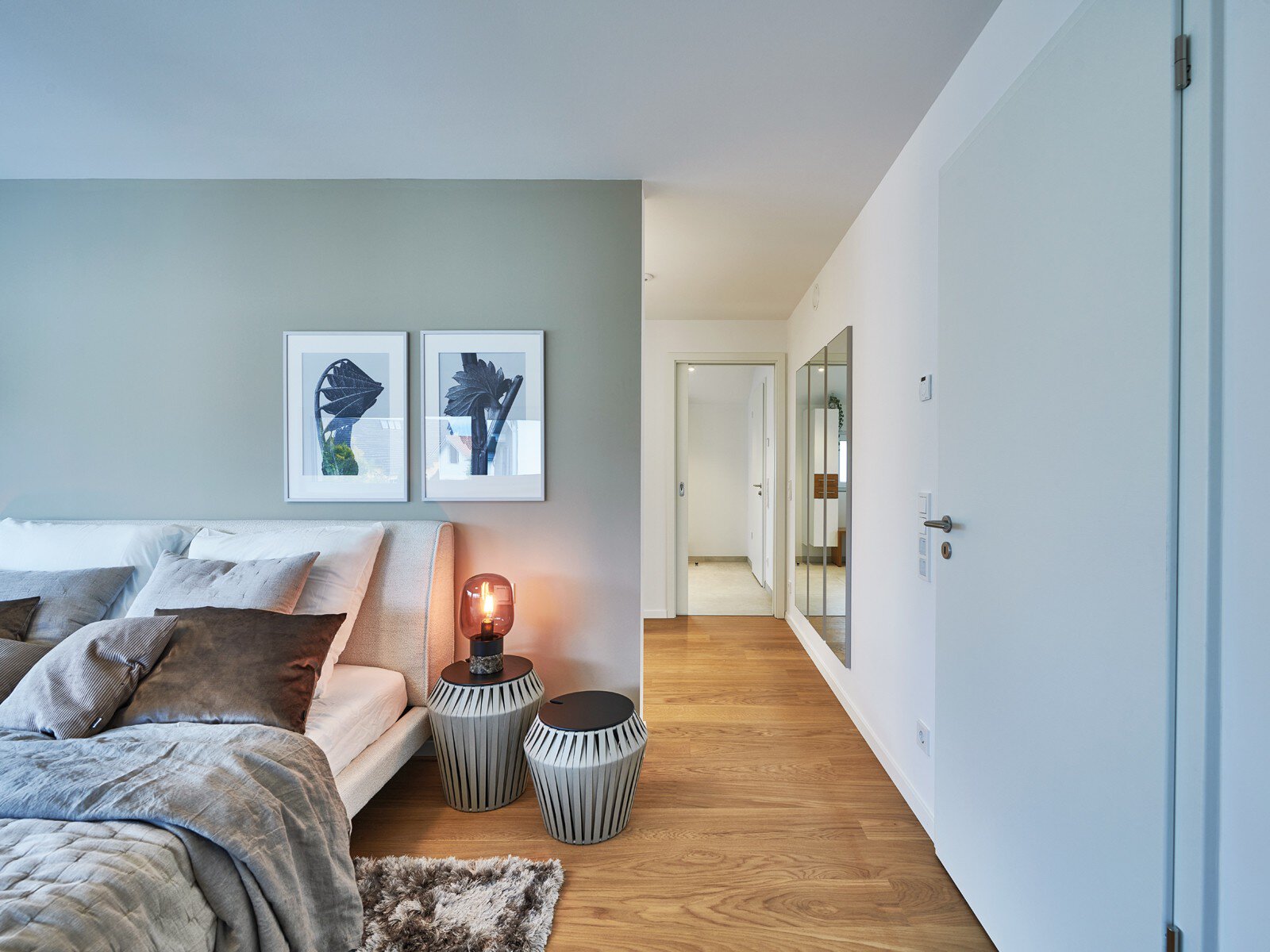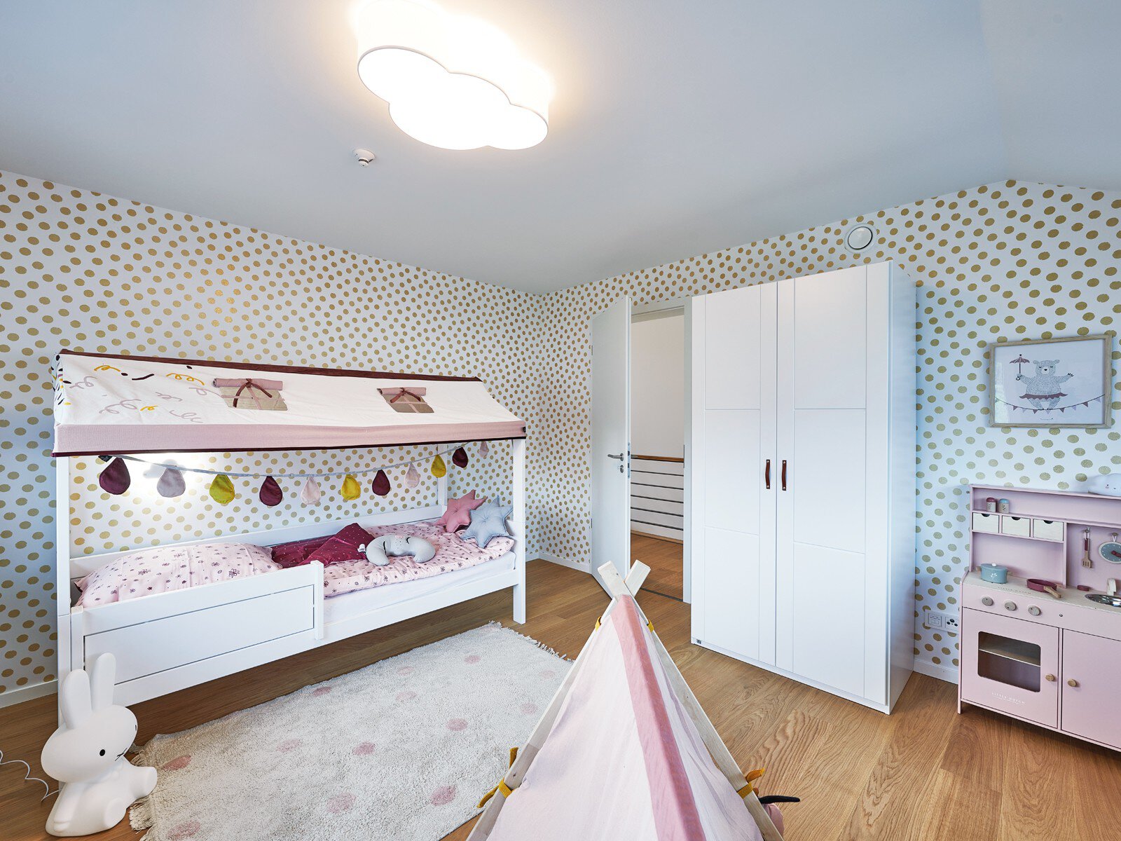 Das neue Musterhaus Poing von Fertighaus WEISS präsentiert einen modernen und flexiblen Grundriss, der Bauherren bis in das hohe Alter begleitet: Familien mit Kindern verfügen mit rund 180 Quadratmetern nutzbarer Bodenfläche über ausreichend Platz und eine gelungene Balance von Gemeinschaft und Individualität. Für das spätere Wohnen auf einer Ebene können ein Duschbad und ein zusätzliches Zimmer im Erdgeschoss genutzt werden. Der Essplatz steht im Zentrum des Hauses und ist in zahlreiche Sichtachsen eingebunden. Dagegen wurde der separierte Wohnbereich als Rückzugsort mit hohem Wohlfühlfaktor gestaltet. Highlights der Innenraumgestaltung des Musterhauses sind die als Möbelstück gestaltete Treppe aus der WEISS-Manufaktur, die an den Außenseiten als Regalfläche genutzt werden kann, sowie der Flur im Dachgeschoss, der dank Galerie und Sitzfenster eine besondere Wohnqualität erhält. Die nachhaltige Holztafelkonstruktion des Hauses wird ergänzt durch eine Photovoltaikanlage mit Batteriespeicher und eine E-Tankstelle. Überdies bietet das Musterhaus Poing den von Fertighaus WEISS gewohnten Komfort und hohe Effizienz bei der Haustechnik: Eingesetzt wurden eine Luft-Wasser-Wärmepumpe, kontrollierte Wohnraumlüftung und Fußbodenheizung sowie ein funkbasiertes, erweiterbares Smart-Home-System. Natürliche und warme Farben bilden beim neuen Musterhaus Poing einen gelungenen Kontrast zum modernen Grau des flachen Satteldaches.
